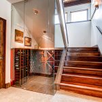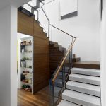 Kehadiran kaca di kabinet di bawah tangga menghalang debu dari menetap di rak dan bertindak sebagai elemen reka bentuk yang menakjubkan