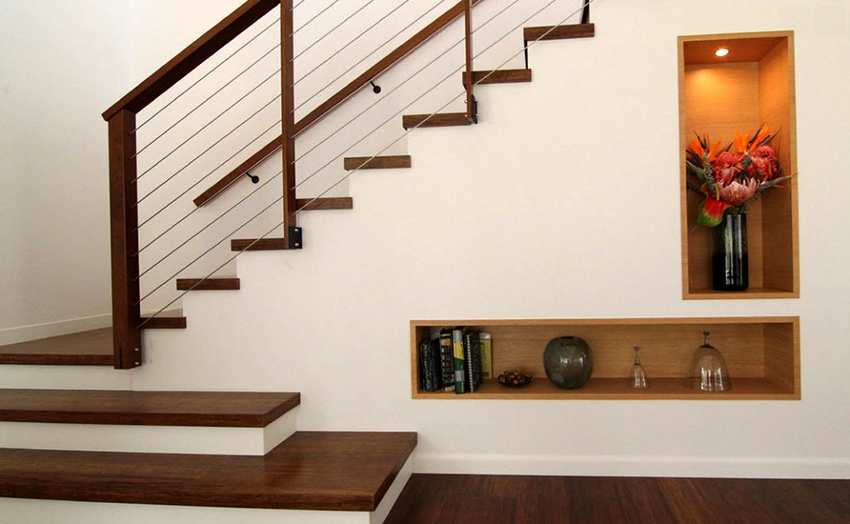 Bahagian belakang langkah boleh digunakan sebagai sokongan untuk memasang rak. Ini membolehkan barang-barang kecil disimpan di bahagian belakang tangga sementara ruang yang tinggal bebas.