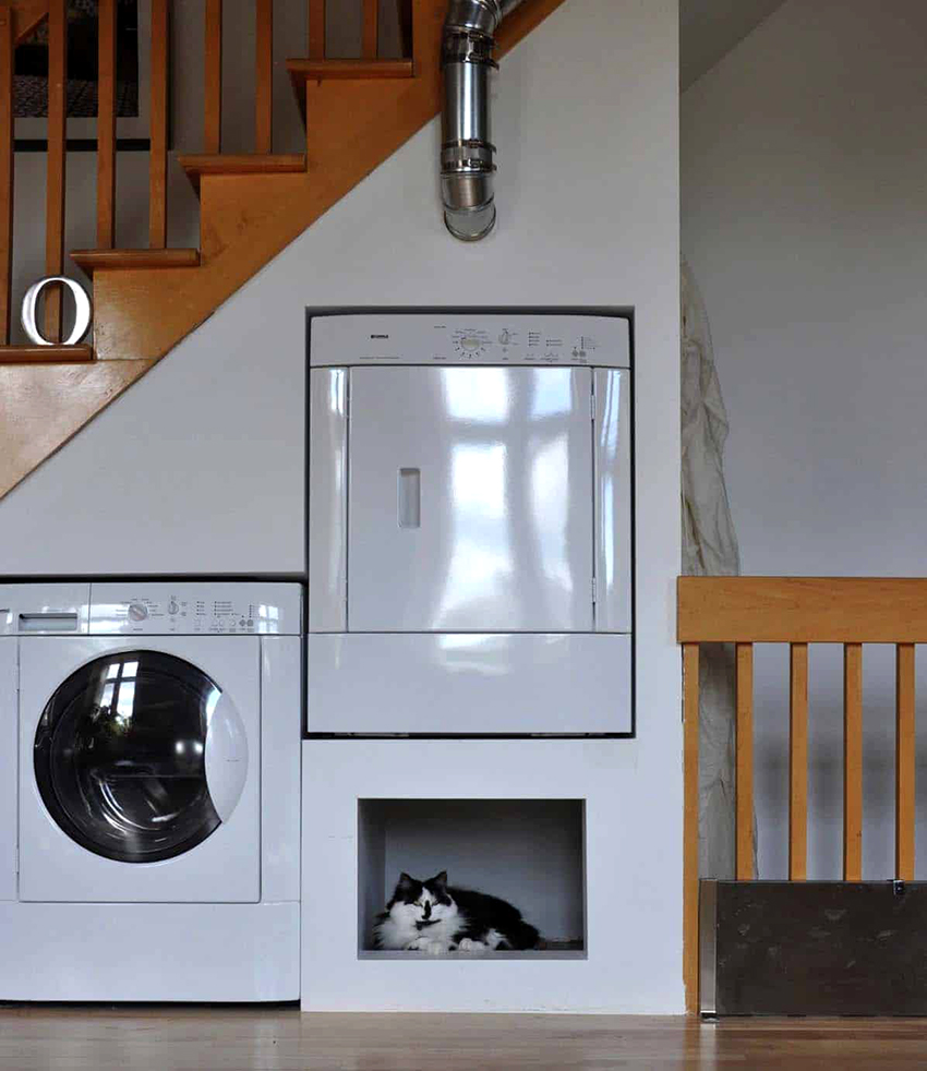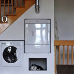 Dalam beberapa kes, mesin basuh dipasang di bawah tangga di dalam kabinet. Untuk melakukan ini, adalah mustahak untuk membawa komunikasi, dan juga mengatur sistem pengudaraan yang berkesan. Kekurangan pengudaraan di dalam bilik, serta kelembapan dalam jumlah yang banyak, boleh menimbulkan kemunculan jamur.