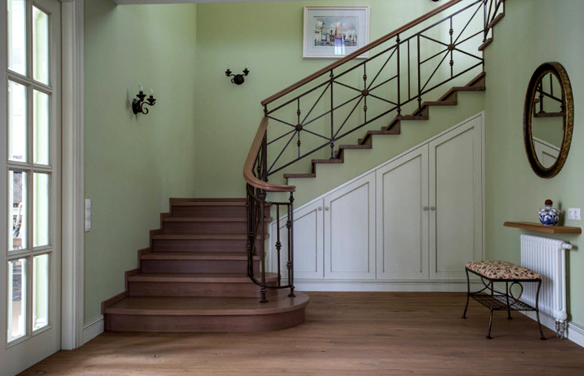 Di rumah negara, dua jenis tangga biasanya dipasang. Struktur Marching mempunyai langkah lurus dan platform antara antara span. Tangga spiral dibuat dalam bentuk lingkaran yang melilit sokongan. Sekiranya dalam kes pertama tidak ada masalah dengan pemasangan perabot, maka pada kedua anda harus mempertimbangkan dengan teliti reka bentuk kabinet masa depan. Tempat di bawah tangga spiral paling baik digunakan untuk melengkapkan sudut rehat. Di kawasan ini, anda boleh meletakkan papan bufet atau laci, sebuah meja kecil.