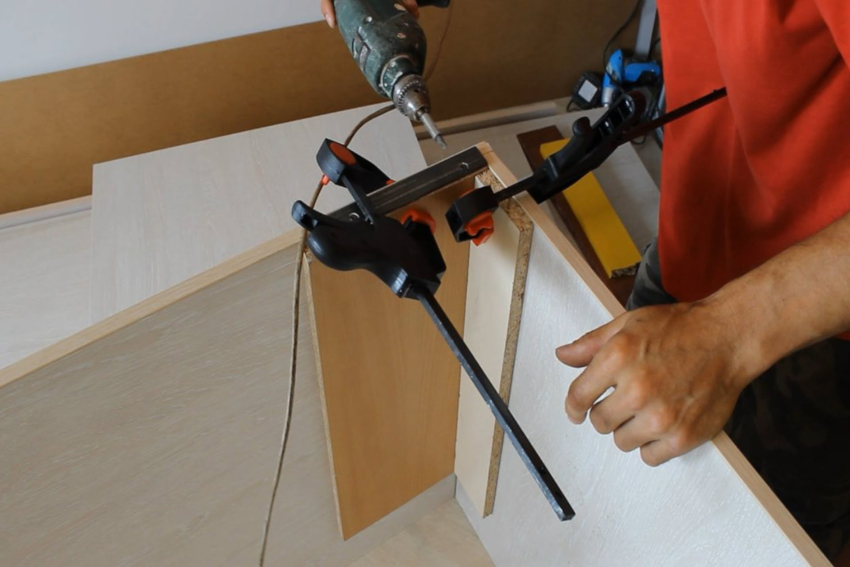 Dinding belakang, sisi dan atas kabinet diganti dengan dinding bilik dan tangga. Berkat ini, kerja pemasangan dipermudahkan. Hanya pintu yang memerlukan kemasan luaran.