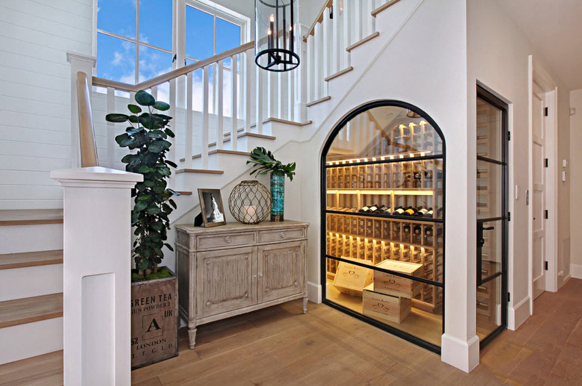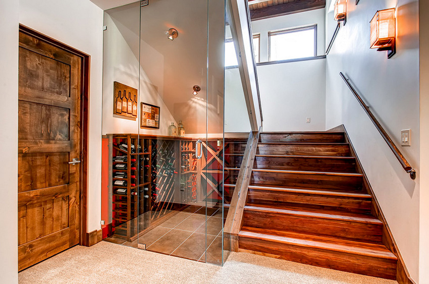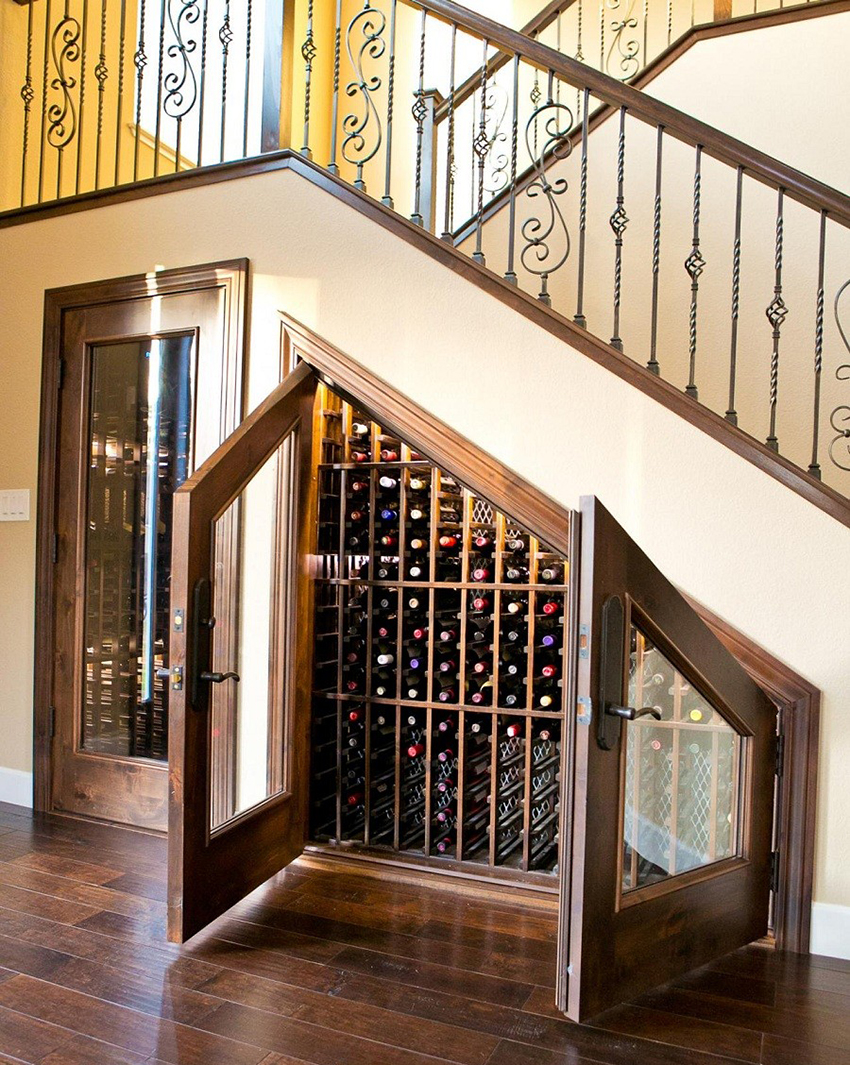 Dengan menggunakan rak seperti itu, anda boleh membuat bilik wain bawah tanah. Rak terbuka di bawah tangga juga berguna di negara ini. Mereka boleh digunakan untuk menyimpan benih, alat kebun kecil dan lain-lain.