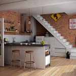 Peralatan rumah tangga dipilih dengan mempertimbangkan ketinggian ruang di bawah tangga. Sudah tentu, dalam kes ini tidak mungkin memasang peti sejuk yang luas dan tinggi. Kawasan ini jarang mempunyai tingkap, jadi anda harus menggunakan lampu yang kuat.