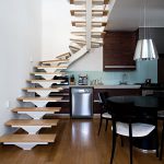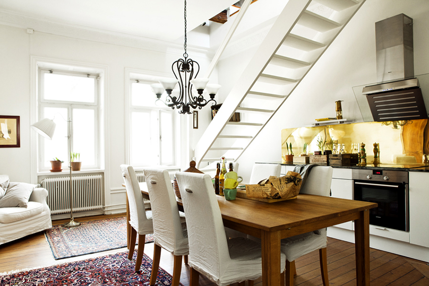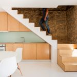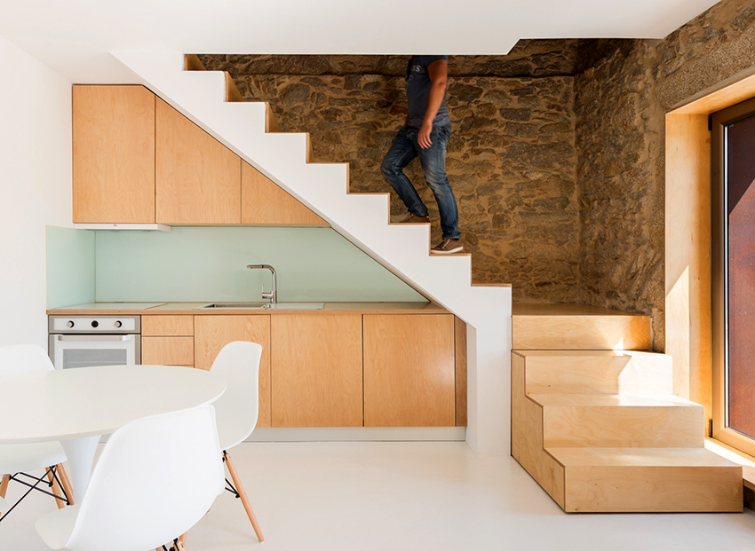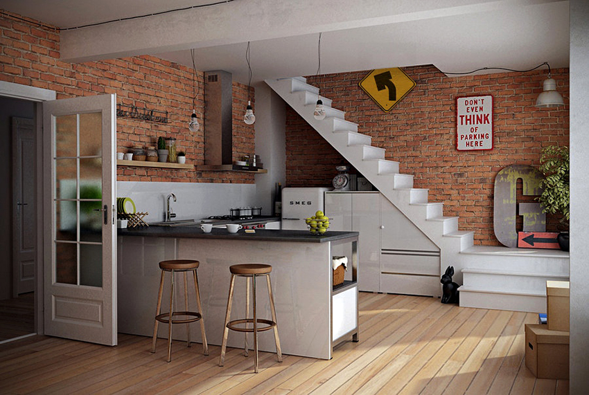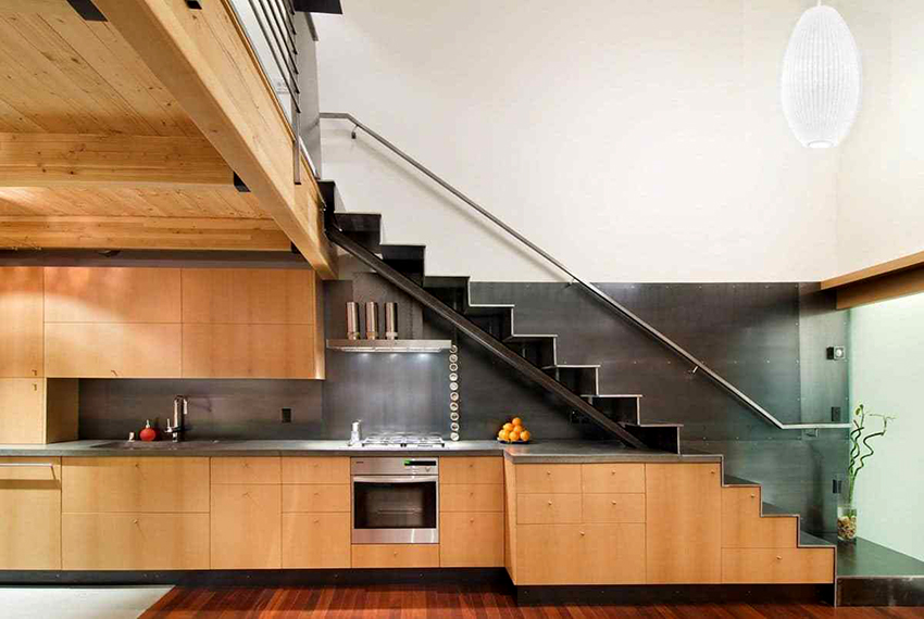 Meletakkan kawasan memasak di bawah tangga mempunyai kelebihan dan kekurangan. Dalam kes ini, dapurnya kemas dan ringkas.