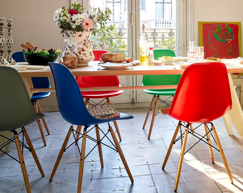 Pemilihan warna yang diperlukan juga bergantung pada bahan pembuatan elemen perabot ini. Model plastik selalunya mempunyai warna yang terang. Sebaliknya, kerusi kayu biasanya dibuat dengan warna yang menenangkan. Model logam digunakan di bahagian dalaman moden (berteknologi tinggi, minimalis) dan mempunyai permukaan krom.