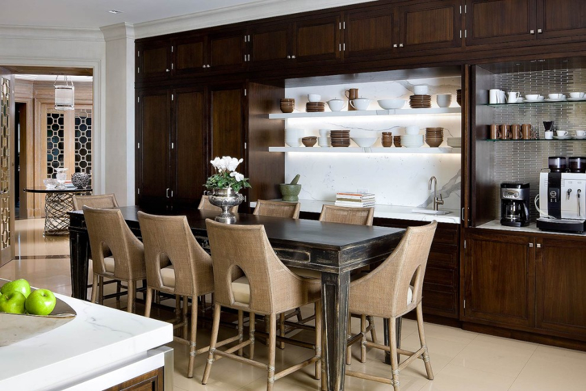 Kerusi klasik untuk dapur adalah pilihan terbaik untuk kawasan ini. Perabot sedemikian sesuai dengan fungsinya dan menyumbang kepada penciptaan suasana yang selesa.