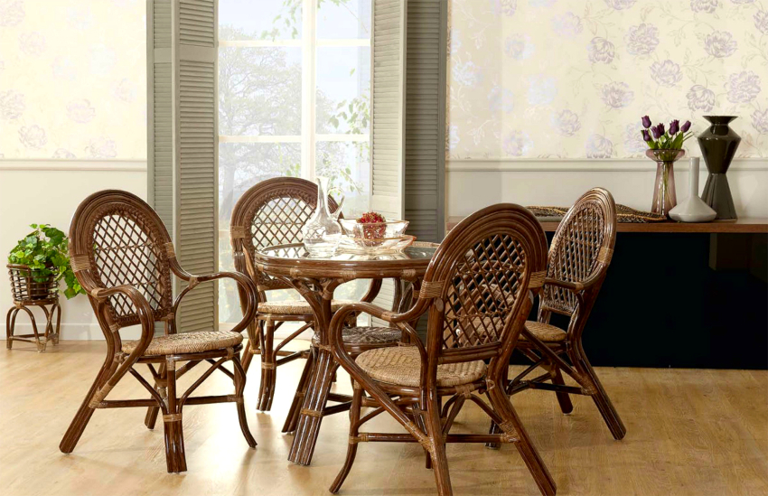 Model anyaman kelihatan sangat rapi, tetapi harganya agak tinggi. Selain itu, kerusi dapur rotan yang bergaya bukanlah perabot serba boleh. Tidak biasa menggunakannya di semua kawasan dalaman. Wickerwork sesuai untuk gaya berikut: negara, provence.