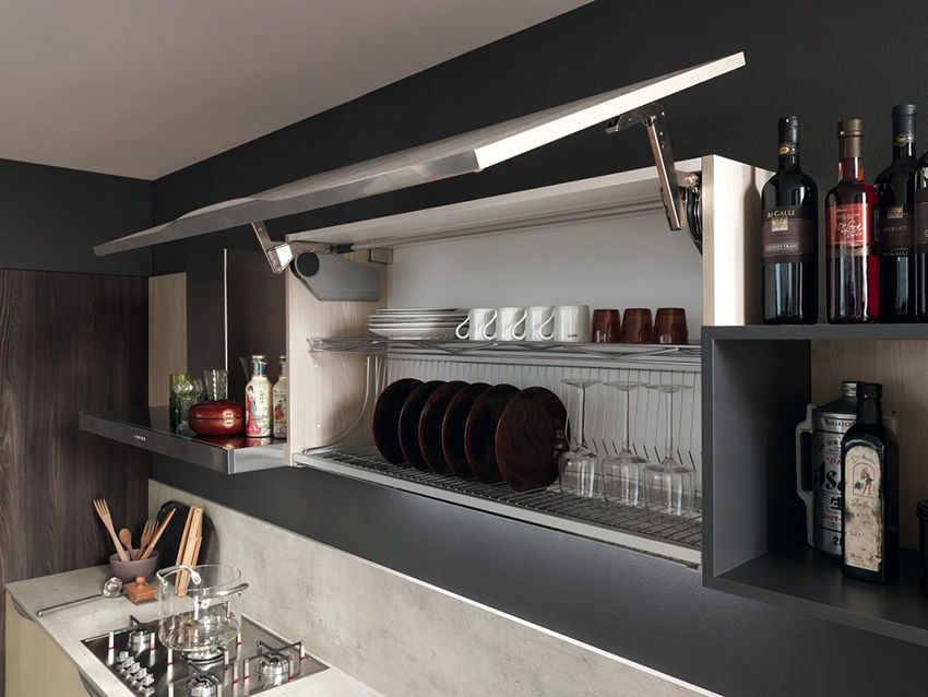 Pengering pinggan di kabinet bawah jarang mempunyai dua atau lebih lapisan. Selalunya ini adalah pembinaan satu tingkat. Sebaliknya, pengering, yang disatukan ke tingkat atas unit dapur, dibezakan dengan pelbagai model. Sama sekali tidak perlu membeli peranti khas untuk tujuan ini.