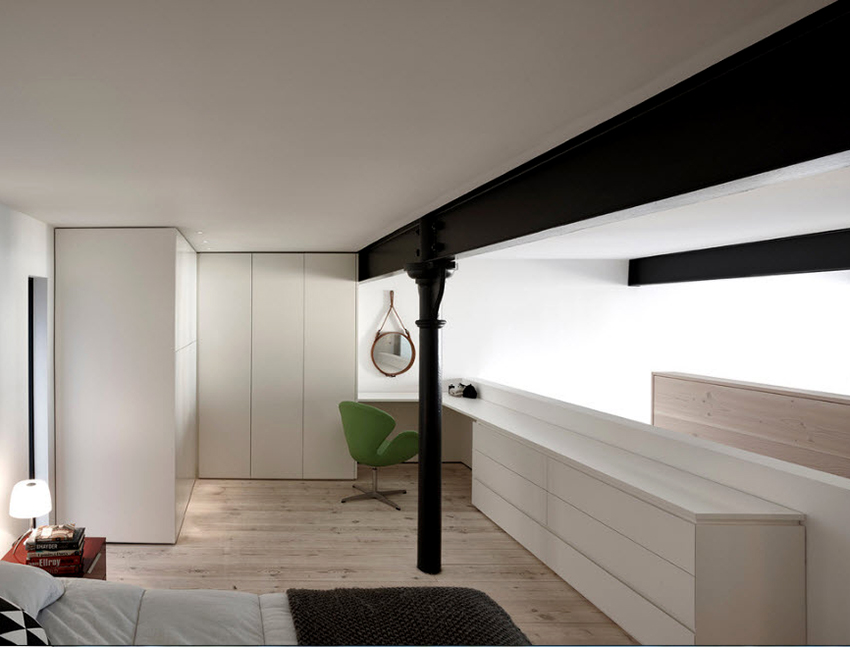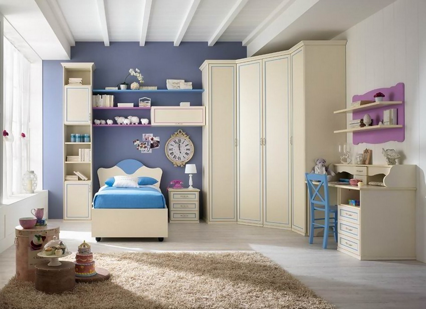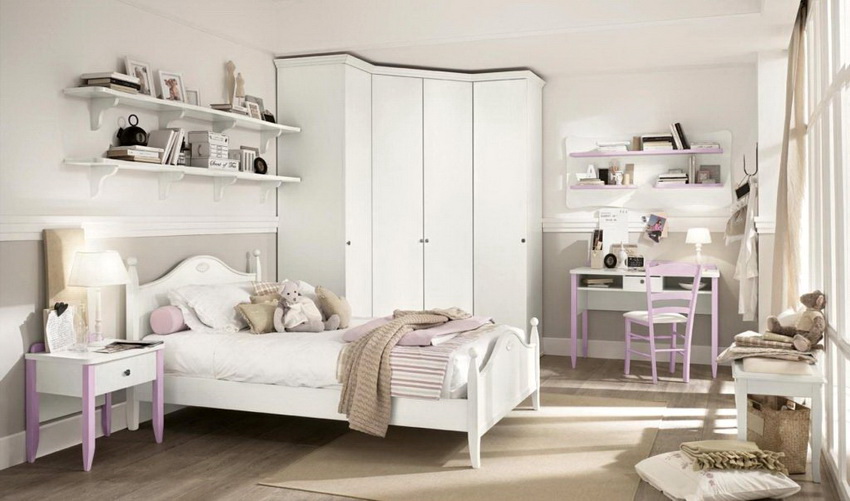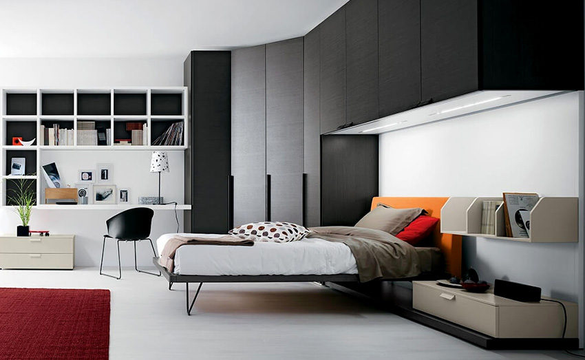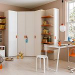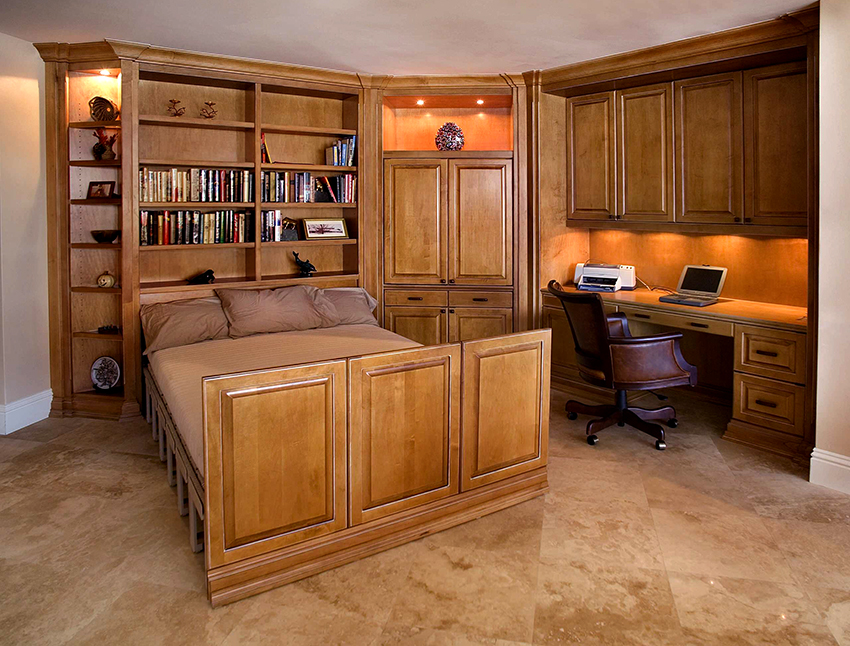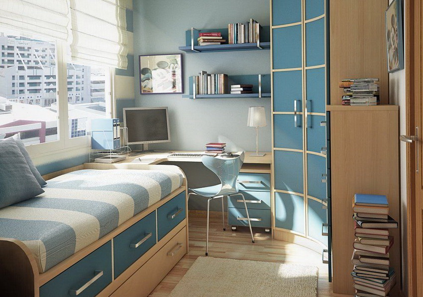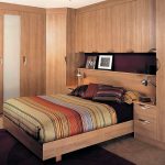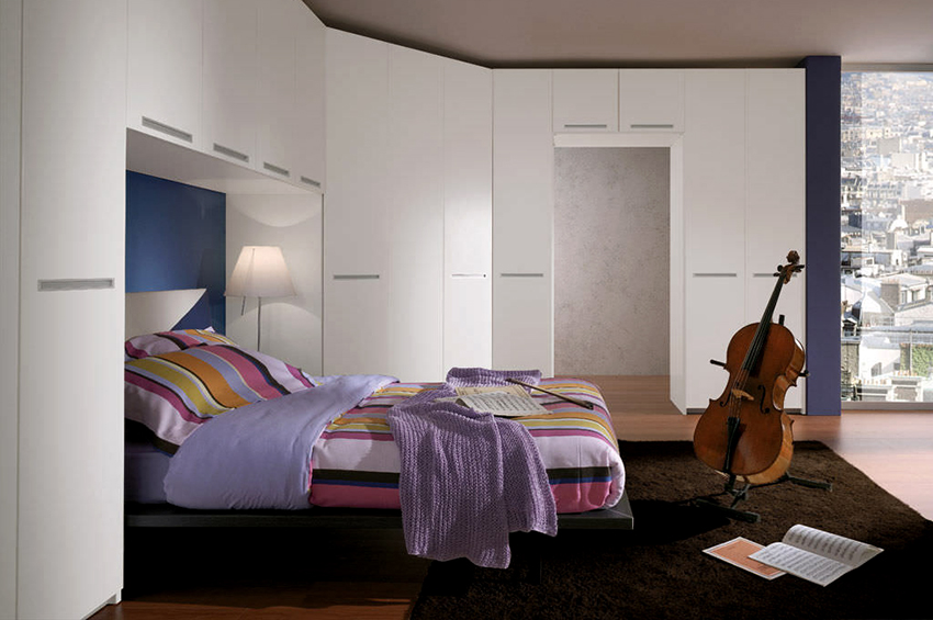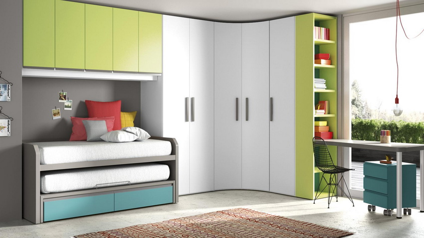 Selalunya di bilik kecil mereka menggunakan pilihan reka bentuk untuk kabinet sudut dengan tempat tidur terbina dalam