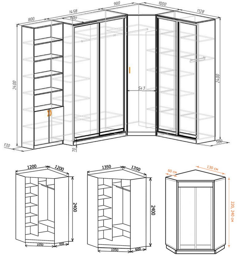 Tidak ada klasifikasi tunggal untuk kabinet sudut dari segi dimensi struktur. Ini disebabkan oleh fakta bahawa pengeluar yang berbeza menggunakan pendekatan individu untuk membuat model tertentu. Di bilik tidur kecil, almari pakaian mesti dipesan dengan dimensi minimum, dan untuk bilik besar anda boleh membuat keseluruhan bilik persalinan. Model khusus ditawarkan, tetapi dimensi dan kandungan dalamannya bergantung pada pilihan pelanggan. Berikut ini dianggap sebagai dimensi standard kabinet sudut: tinggi - 2-2,5 m, kedalaman - 0,3-0,7 m, lebar - 0,7-2,4 m.