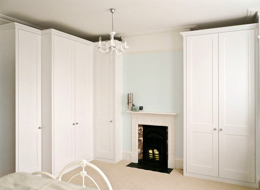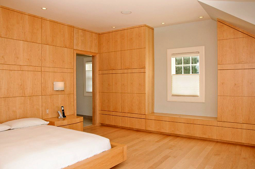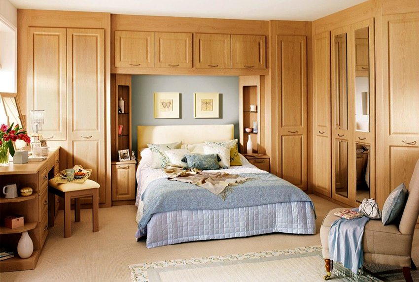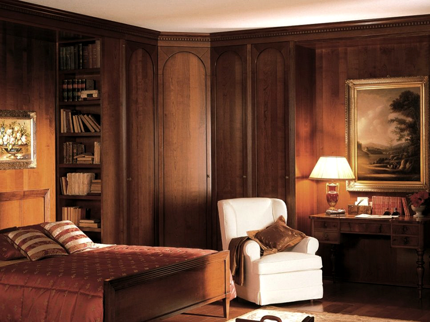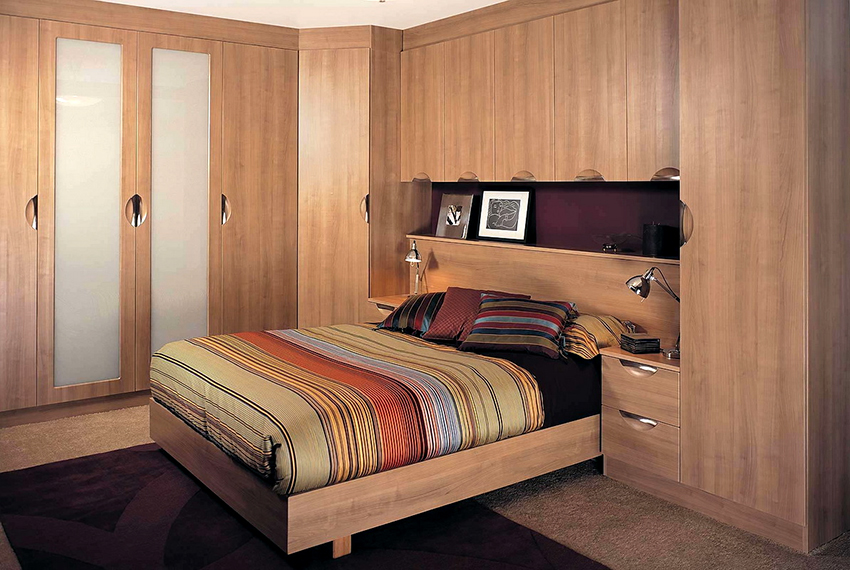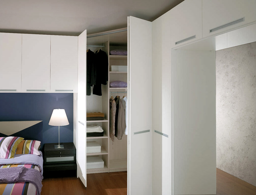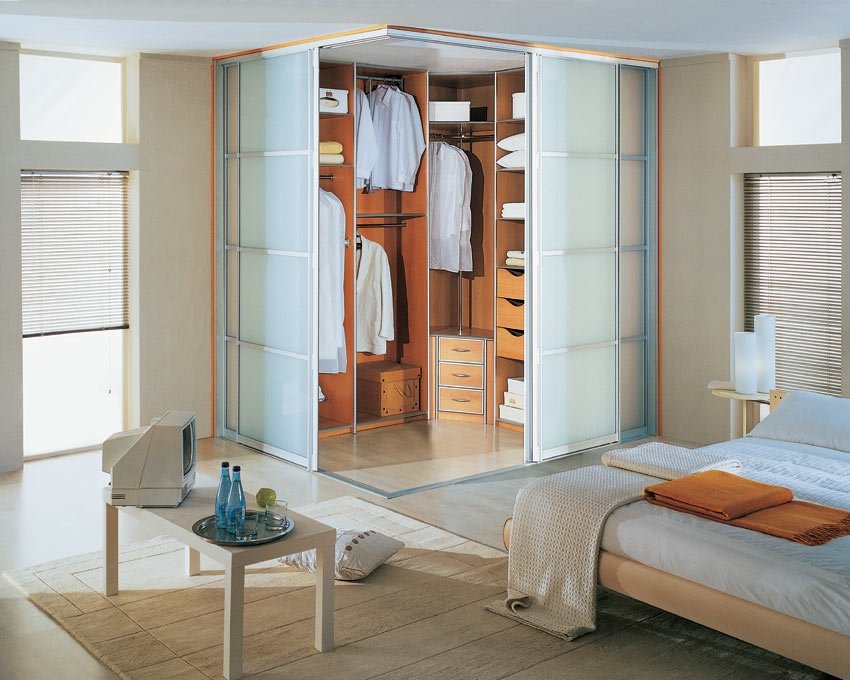 Kerana pelbagai bentuk, almari pakaian sudut di dalam bilik tidur dapat dimasukkan ke dalam ceruk mana pun, yang akan memungkinkan struktur bergabung dengan permukaan dinding. Kelemahan utama kabinet terbina dalam adalah ketidakmungkinan pergerakannya, kerana dimensi semua elemen penyusun struktur dibuat untuk tempat yang ditentukan khas.