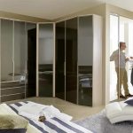Sekiranya almari pakaian sudut terletak di bilik kecil, pilihan yang ideal untuk model ini adalah fasad cermin, yang bukan hanya menghiasi ruangan, tetapi juga memperluas kelapangan secara visual. Dengan menggunakan teknologi moden, permukaan dapat diberi penampilan yang unik. Contohnya, fasad harus dilapisi pasir atau difoto. Foto almari bilik tidur dalam gaya moden memaparkan model yang tidak biasa dan asli.