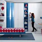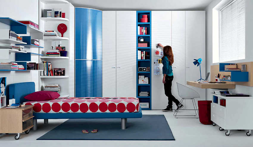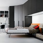 Untuk membuat aksen di dalam bilik, dibenarkan memasang kabinet dengan fasad terang. Walau bagaimanapun, dalam kes ini, bilik tidur harus dihiasi dengan warna cahaya yang tenang. Jika tidak, bilik akan dipenuhi dengan aksen yang kaya.