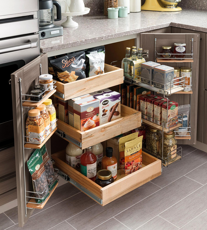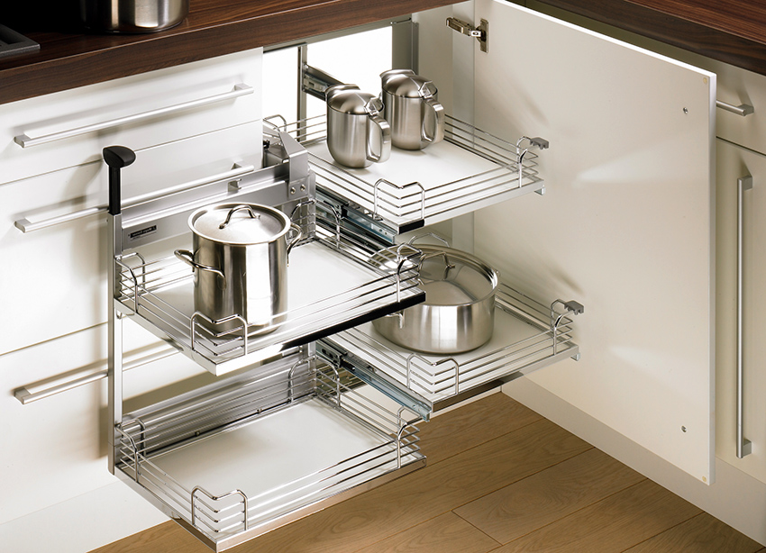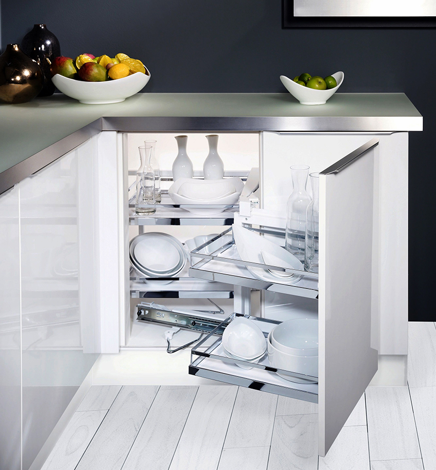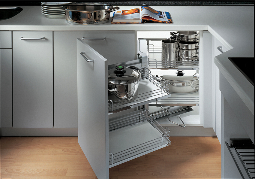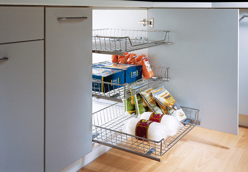 Keranjang sudut tarik untuk dapur juga popular, kerana mereka menyusun sambungan dua dinding dengan betul, di mana sangat sukar untuk meletakkan perabot biasa, apabila dipasang, sukar untuk mendapatkan barang yang diperlukan dari sudut jauh.