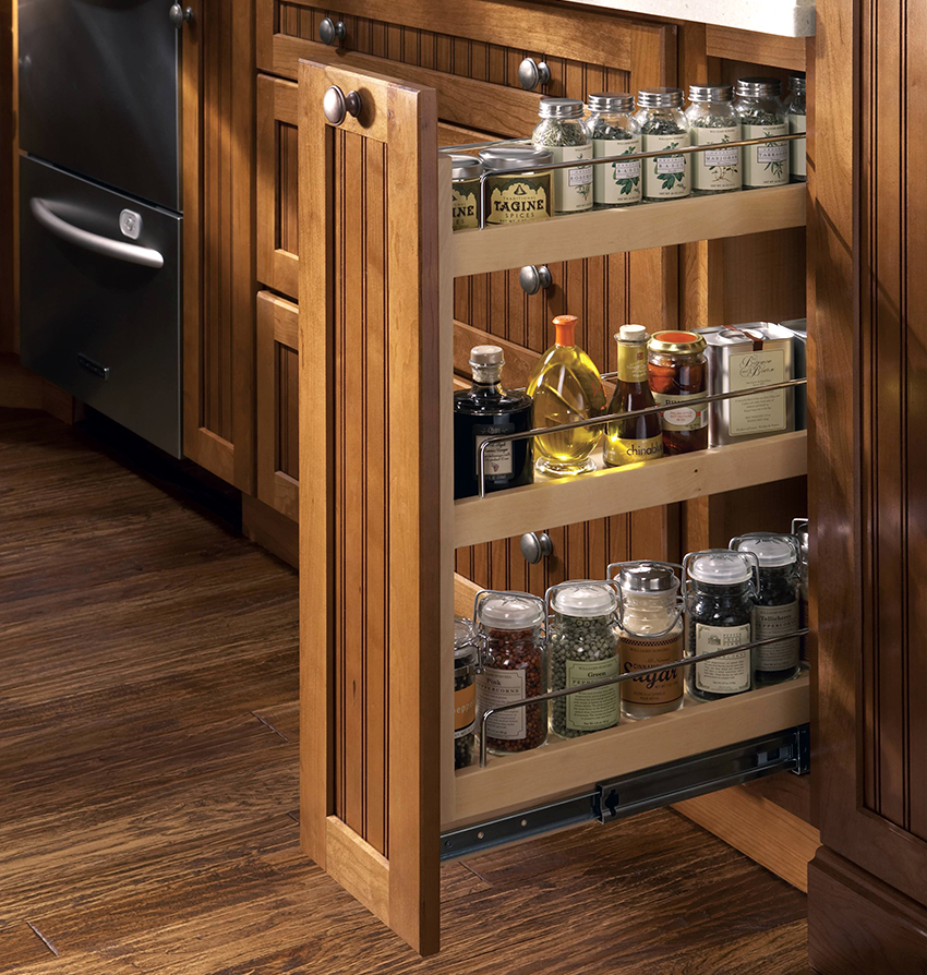 Ini disebabkan oleh fakta bahawa ruang dalaman rak tarik untuk dapur terbahagi kepada beberapa bahagian, yang membolehkan anda menggunakan ruang yang boleh digunakan di dalam bilik dengan bijak. Rak sedemikian boleh ditarik keluar satu bahagian pada satu masa atau semuanya pada masa yang sama, sementara pilihan yang terakhir membolehkan anda segera memeriksa pengisian seluruh kabinet dan mencari barang yang diperlukan dengan cepat. Bergantung pada bentuk dan tujuannya, kotak dapat digunakan untuk menyimpan barang seperti: