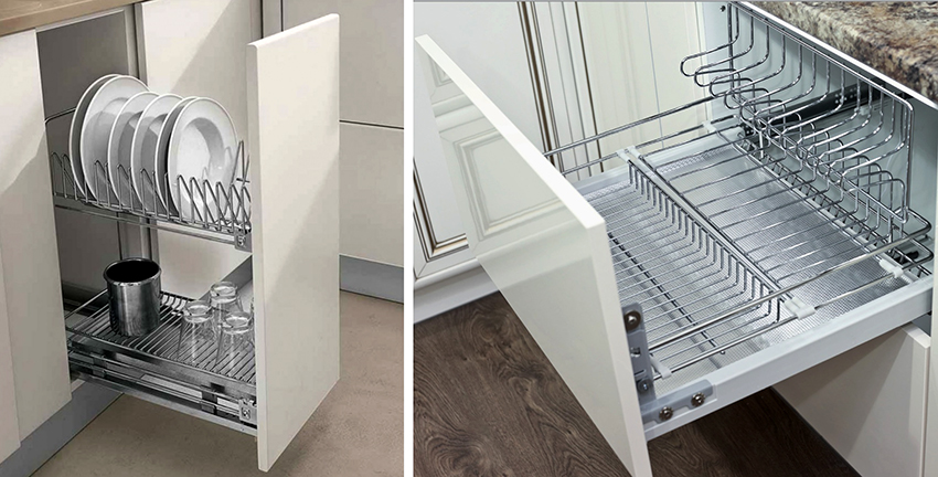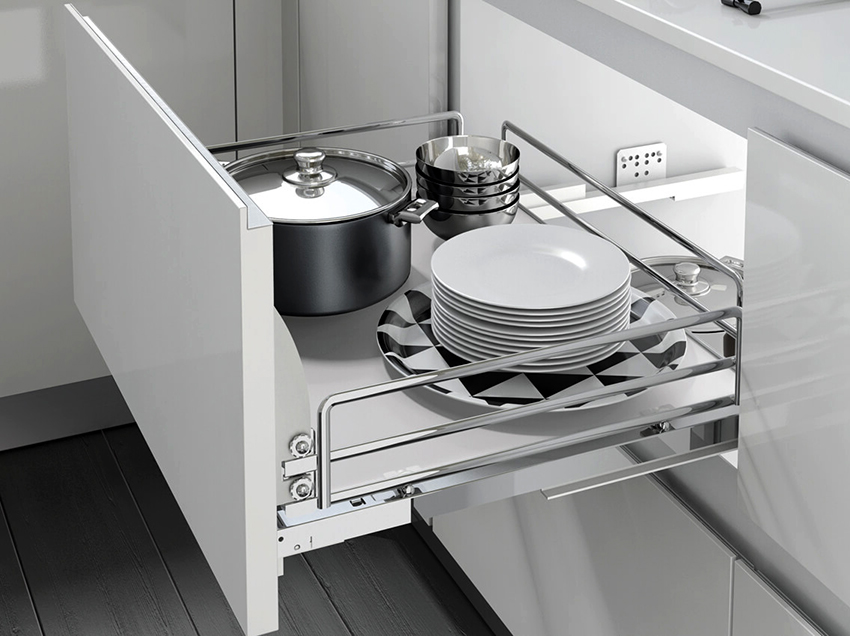 Sistem laci terbina dalam membantu menggunakan kabinet mengisi dalaman dengan cekap, mengambil tempat yang sukar dijangkau di mana pilihan laci klasik tidak dapat ditempatkan. Contohnya, dengan bantuan alat kelengkapan yang boleh ditarik, anda dapat menggunakan ruang di atas tong sampah dengan cekap, yang biasanya tidak dituntut, atau memenuhi sudut buta yang sukar dicapai.