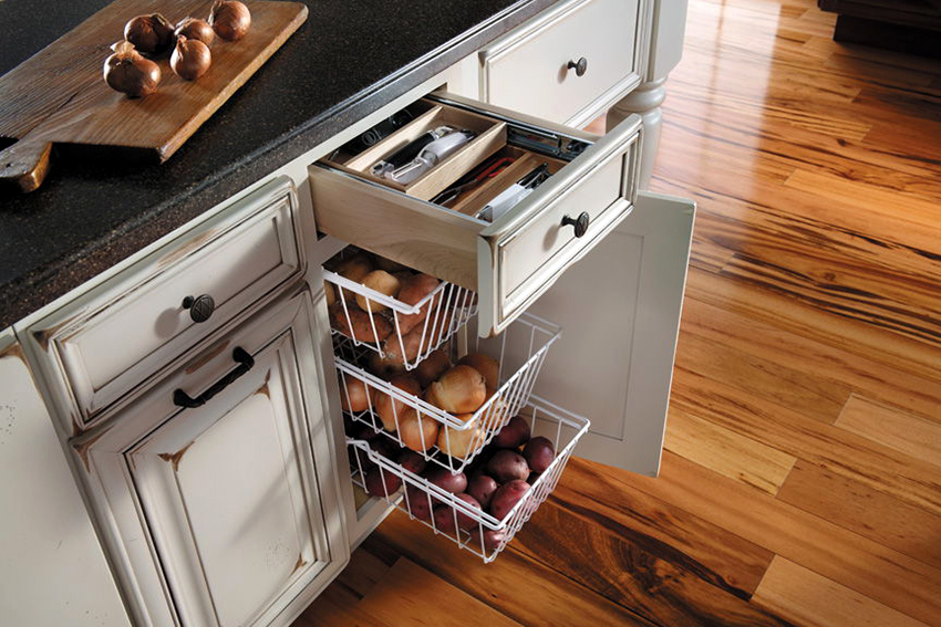 Syarat utama dapur moden adalah memberi akses percuma ke pelbagai barang. Keranjang tarik keluar untuk kabinet dapur akan membantu melaksanakannya. Sudah tentu, kehadiran mereka tidak menggantikan kehadiran kabinet dinding, yang secara signifikan menjimatkan ruang di dapur.Walau bagaimanapun, barang-barang yang terletak di bahagian belakang kabinet tidak dapat dicapai tanpa menggunakan bangku, terutama jika orang itu tidak tinggi. Dalam hal ini, sistem laci untuk dapur dianggap lebih berfungsi, kerana semua barang yang sering digunakan terletak di tingkat tangan, jadi mudah untuk mencari barang yang diperlukan.