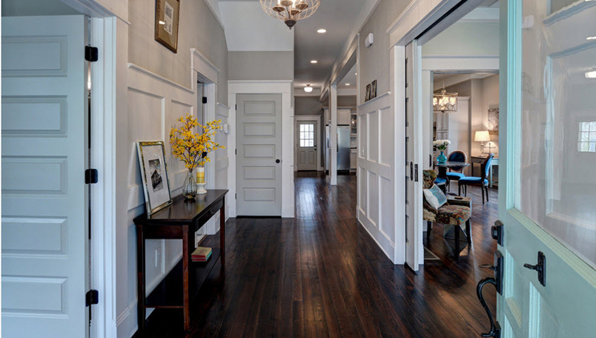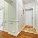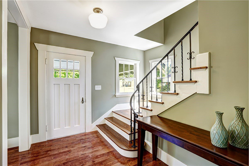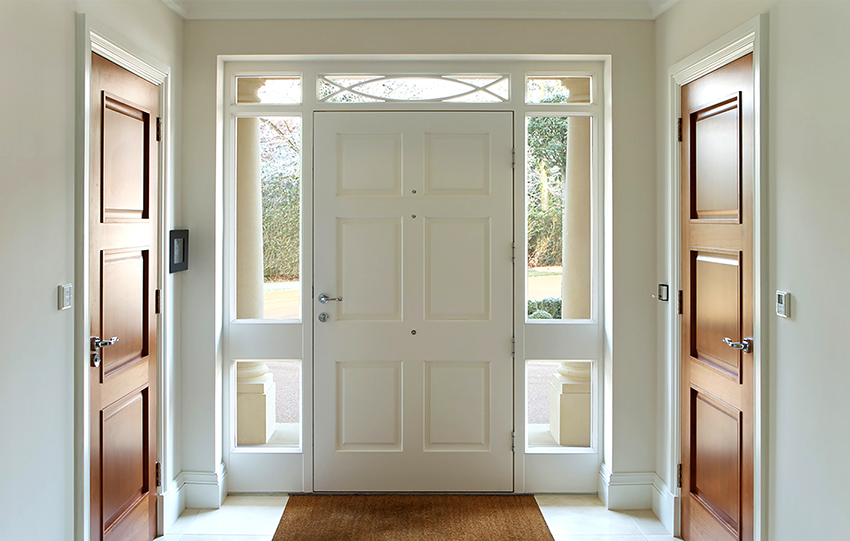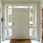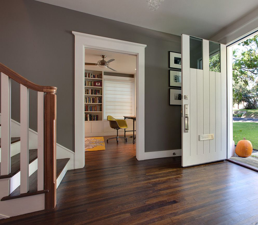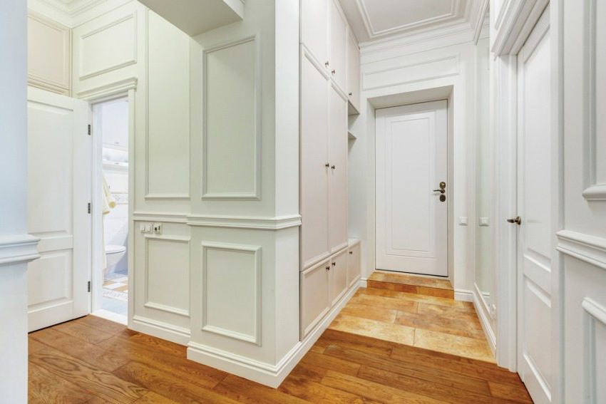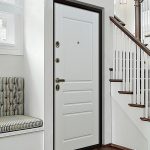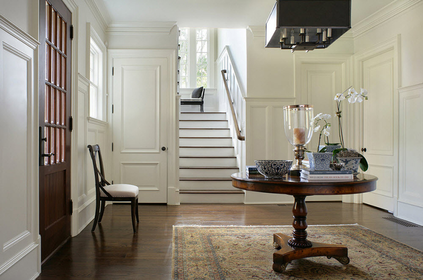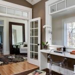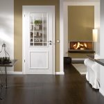 Pintu putih kelihatan cukup mengagumkan di bahagian dalam dengan lantai kayu gelap.Tambahan yang indah untuk reka bentuk ini akan menjadi plat plat, dibuat agar sesuai dengan lantai. Menggunakan unsur-unsur ini akan membuat aksen di sekitar pintu cahaya.