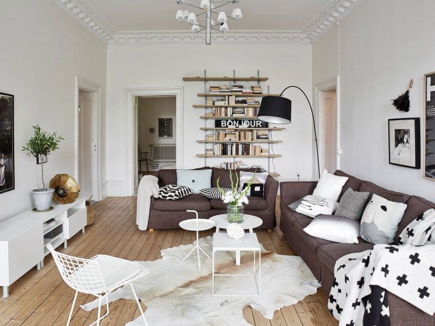 Minimalisme adalah salah satu trend paling popular dalam reka bentuk moden. Bilik-bilik yang dirancang dengan gaya ini mempunyai lantai gelap. Warna coklat dan kelabu digunakan untuk hiasan dinding. Dalam persekitaran seperti itu, pintu putih akan kelihatan asli jika dilengkapi dengan papan skirting putih atau bingkai tingkap.
