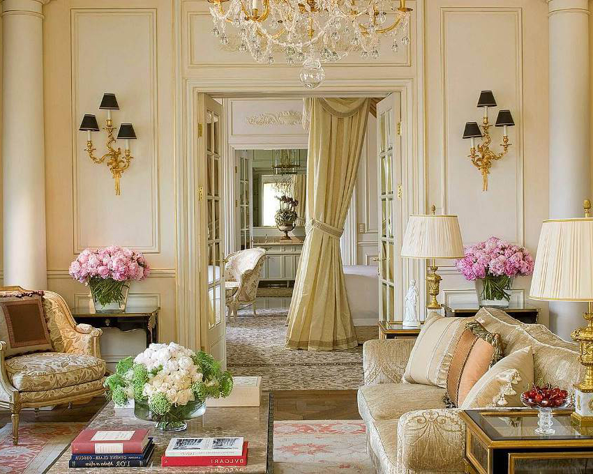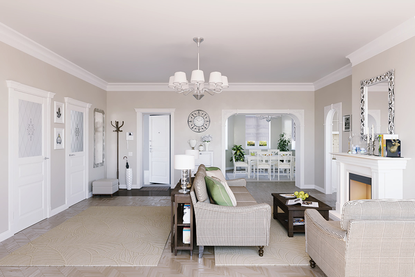 Gaya klasik adalah trend reka bentuk tertua yang digunakan di bahagian dalam ruang tamu, yang menggabungkan unsur-unsur budaya yang berbeza. Dalam kes ini, struktur pintu digunakan sebagai perincian tambahan yang membezakan atau melancarkan skema warna pada kemasan.