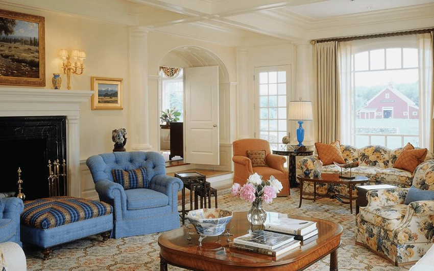 - ulangi kelengkapan atau tekstur pada pelapis perabot di ruang tamu;