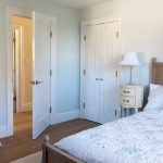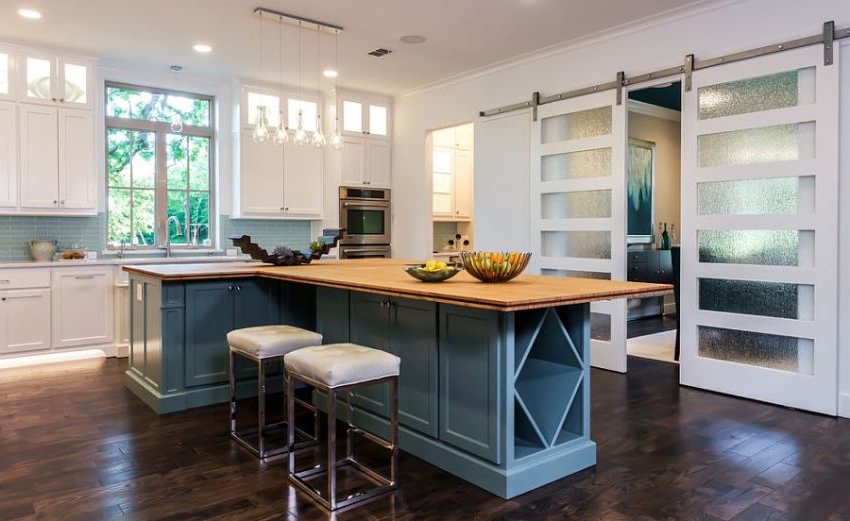 Untuk mewujudkan suasana tenang dan segar, kami mengesyorkan menggunakan kemasan biru. Gabungan dinding sejuk dan pintu putih bersih adalah satu-satunya pilihan yang berfungsi untuk dalaman dengan warna biru. Reka bentuk yang serupa biasanya digunakan dalam gaya klasik. Dalam kes ini, pintu putih akan dilengkapi dengan tiruan trim panel. Untuk ini, bingkai yang diperbuat daripada cetakan boleh digunakan.