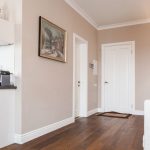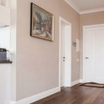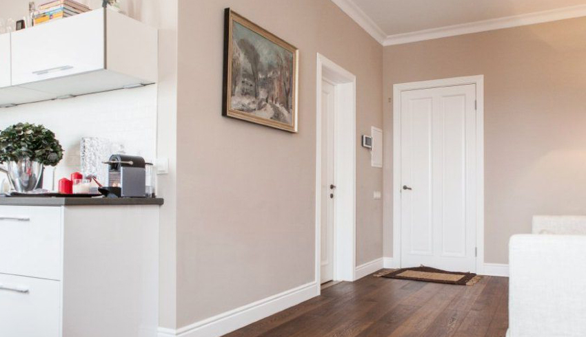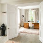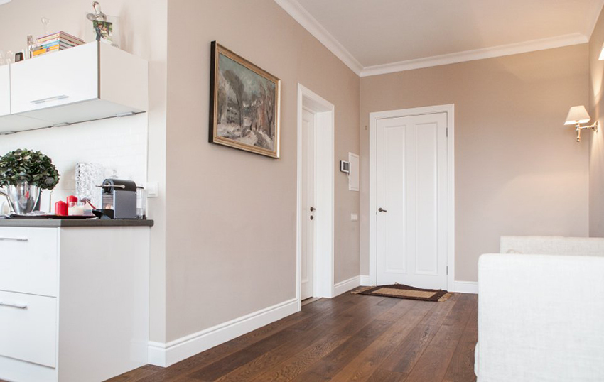 Nasihat berguna! Sekiranya papan skirting ringan digunakan untuk aksen pada pintu putih, maka lebih baik mengambil permaidani sebagai penutup lantai. Kemasan bertekstur kayu juga sesuai. Dengan gabungan seperti itu, semua elemen dalaman akan kelihatan harmoni.
