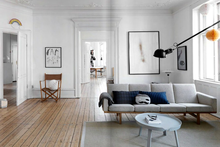 Penggunaan pintu putih klasik juga khas untuk gaya Scandinavia. Bahagian dalaman ini didasarkan pada warna terang dan pencahayaan yang terang. Memandangkan keadaan ini, kita dapat mengatakan bahawa kehadiran kanvas putih bukan hanya diinginkan, tetapi perlu. Penyelesaian seperti itu sangat sesuai untuk kes-kes apabila diperlukan untuk mencapai pengembangan ruang secara visual.