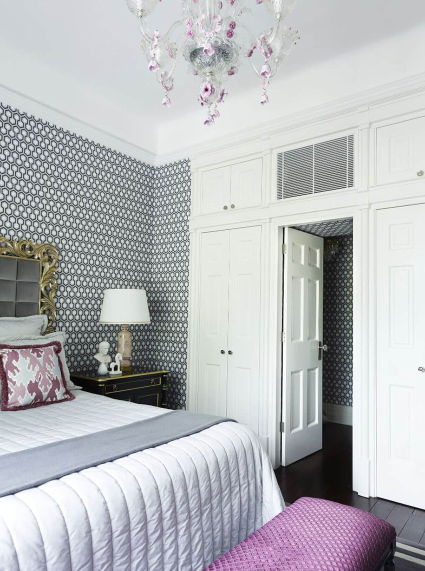 Gabungan pintu putih dan dinding ungu digunakan untuk mewujudkan suasana mewah dan megah. Warna ungu kaya, sukar bagi jiwa manusia, dan oleh itu boleh menyebabkan penipisan sistem saraf dengan cepat. Kesannya, keadaan ini hanya akan menyedihkan. Kehadiran pintu putih di bahagian dalaman seperti ini meniadakan kesan negatif ini.
