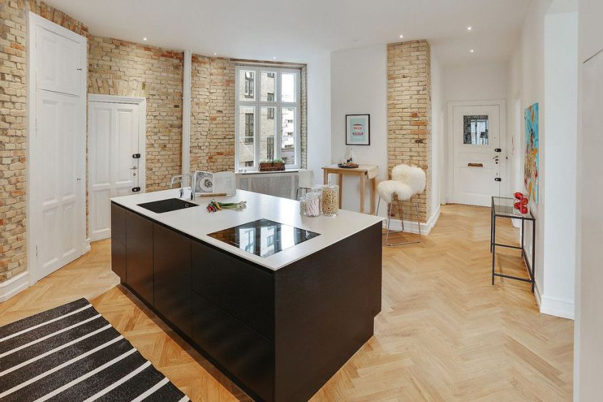 Untuk menghias bilik besar dengan gaya moden, cukup menggunakan hiasan dinding gelap, perabot kayu ek yang diputihkan yang akan berbeza dengan latar belakangnya, dan pintu dalaman dengan warna yang sama.