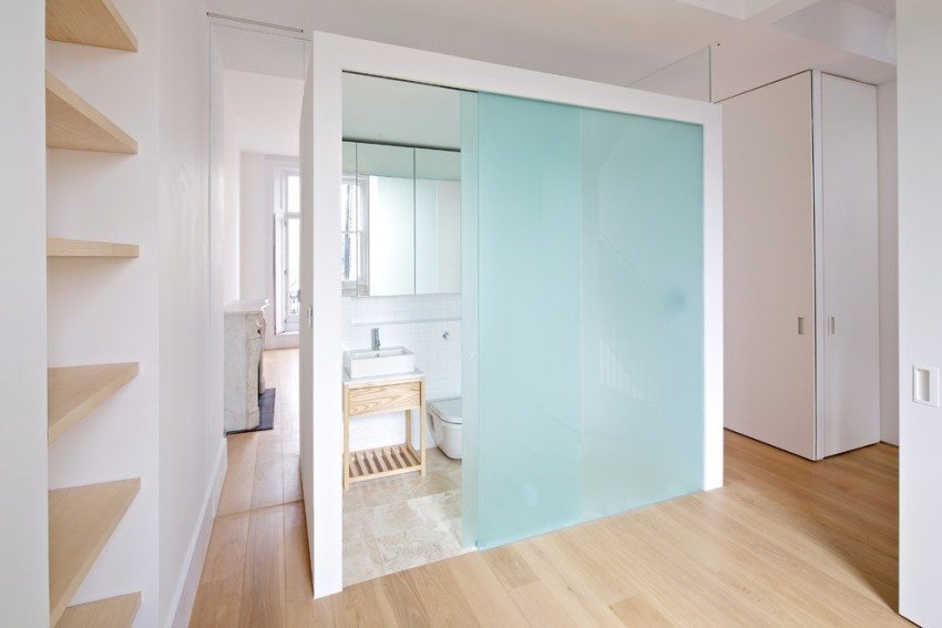Pintu gelangsar ke bilik mandi dan tandas boleh dibuat dari semua bahan yang disebutkan. Memandangkan pemasangan pintu petak membawa kepada kos tambahan bahan dan sumber masa, ini adalah salah satu penyelesaian pembinaan dan reka bentuk yang optimum.