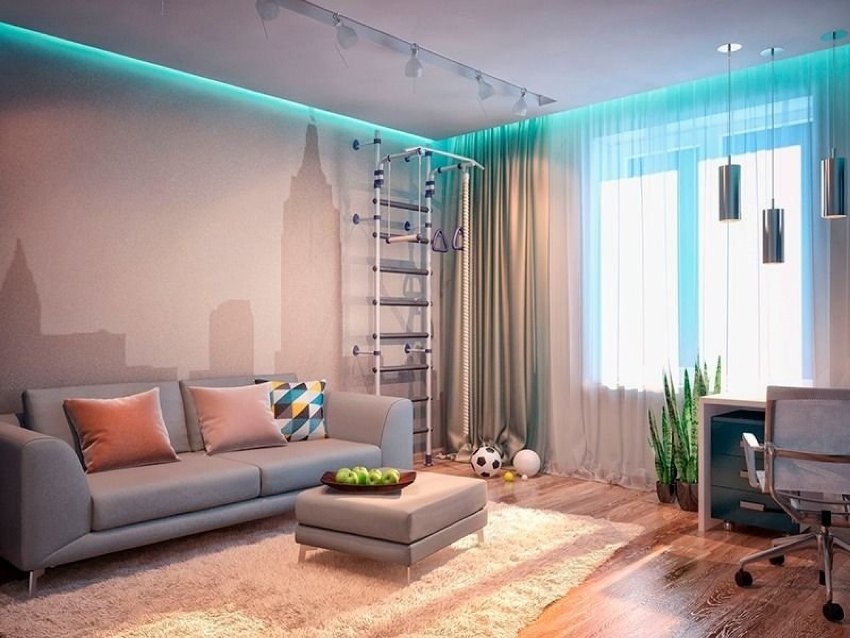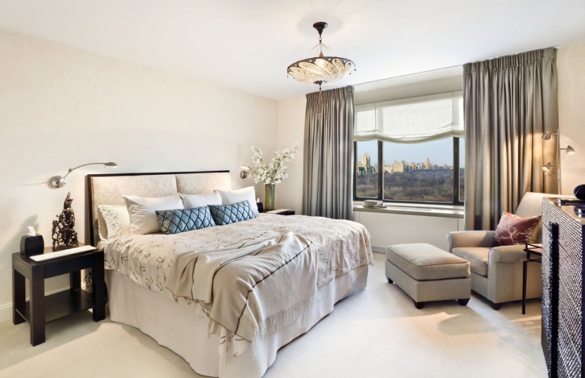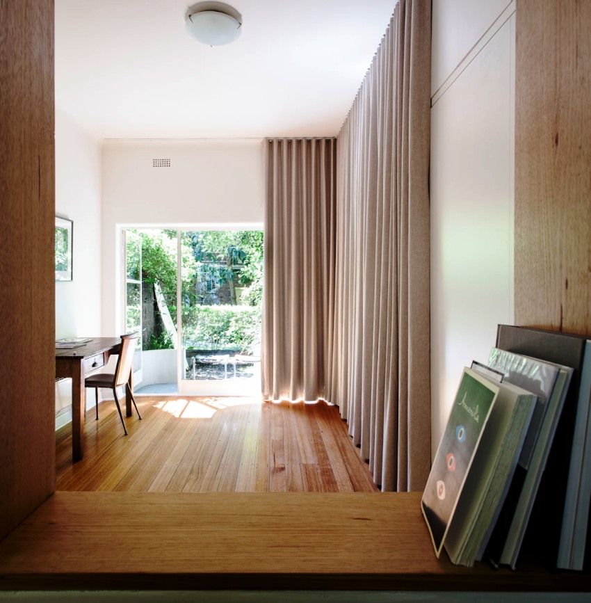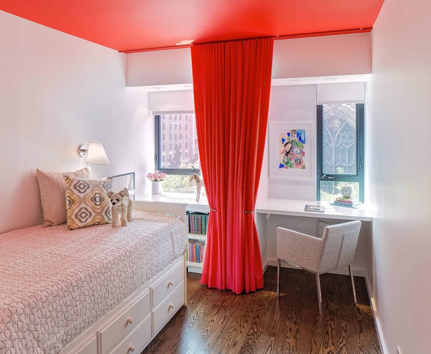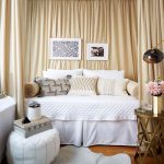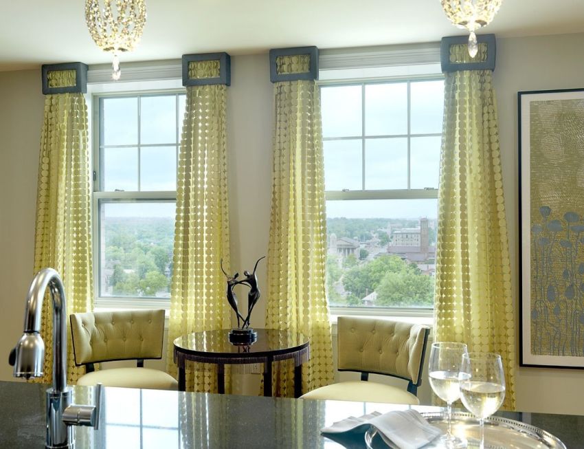 Oleh itu, ceruk dibentuk antara dinding dan siling untuk pemasangan tirai yang tersembunyi. Pilihan ini memberikan hiasan tingkap yang tidak biasa dan asli, meringankan keadaan dan menambahkan kelantangan ke ruang.
