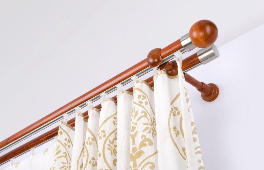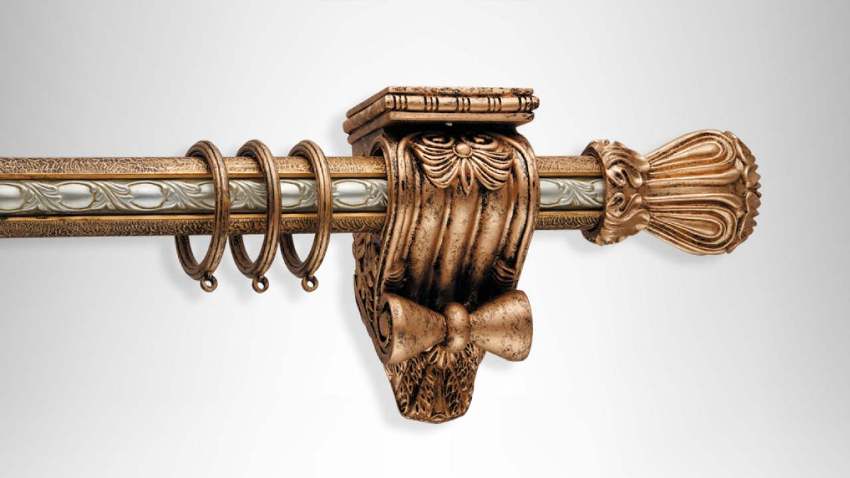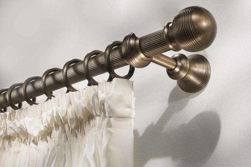 Bergantung pada jenis reka bentuk produk, tirai boleh disusun dengan cara yang berbeza. Walau bagaimanapun, ia merangkumi elemen asas berikut. Di hujung cornice, finial dapat dipasang, yang diwakili oleh petua keriting. Ia digunakan terutamanya untuk langsir bulat.