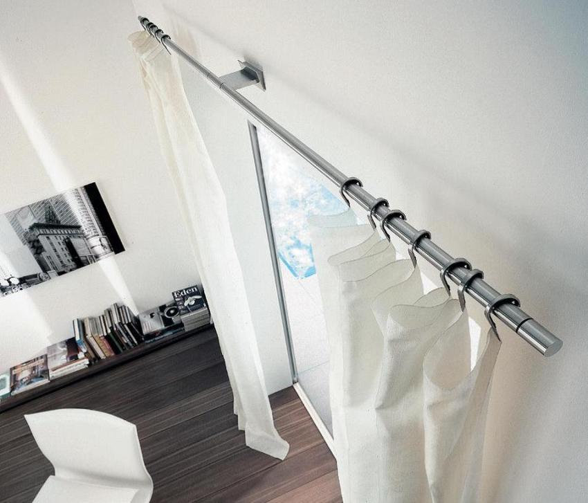 Seterusnya, kami akan mempertimbangkan apakah tirai untuk lokasi dinding, bergantung pada reka bentuknya. Batang tirai bulat atau berbentuk tiub adalah tradisional dan biasa. Model moden diwakili oleh produk satu baris dan dua baris dengan batang selari dengan diameter yang berbeza.