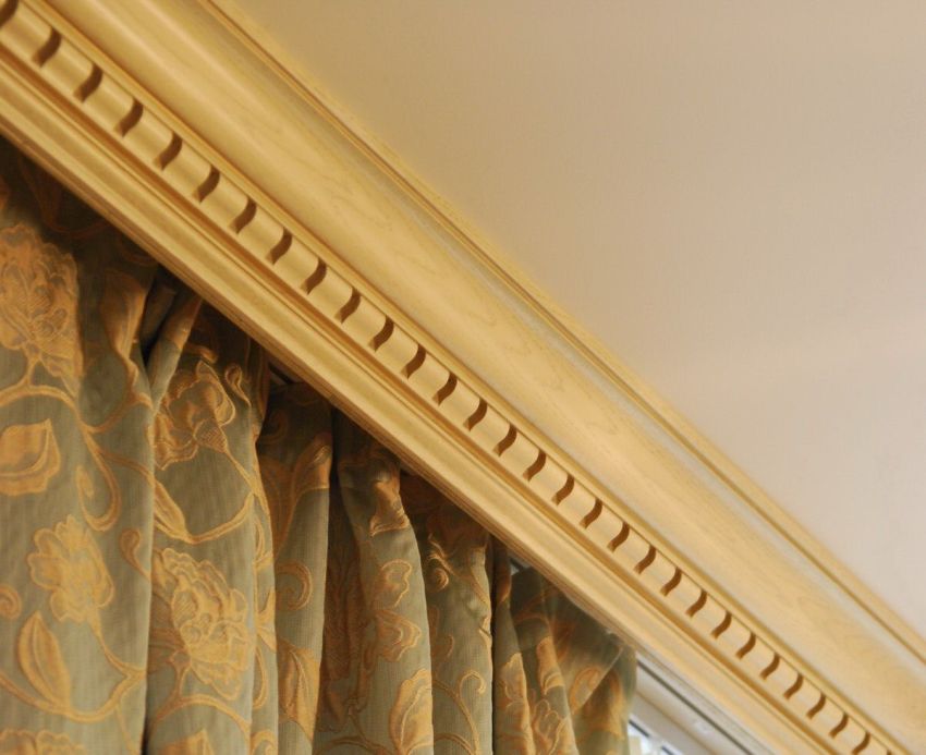 Cornice baguette diwakili oleh struktur tayar, yang dilengkapi dengan jalur hiasan yang diukir. Dalam model moden, tempat khas diatur di bawah bar untuk lampu latar LED, yang akan memberikan daya tarikan istimewa pada tirai.