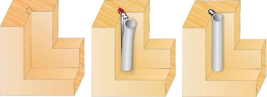 Profil PVC dimasukkan ke dalam ceruk yang dibuat. Penting agar tidak ada pertindihan di sudut. Sebaiknya lakukan prosedur ini dengan pembantu, kerana agak sukar untuk melakukan semuanya sendiri.