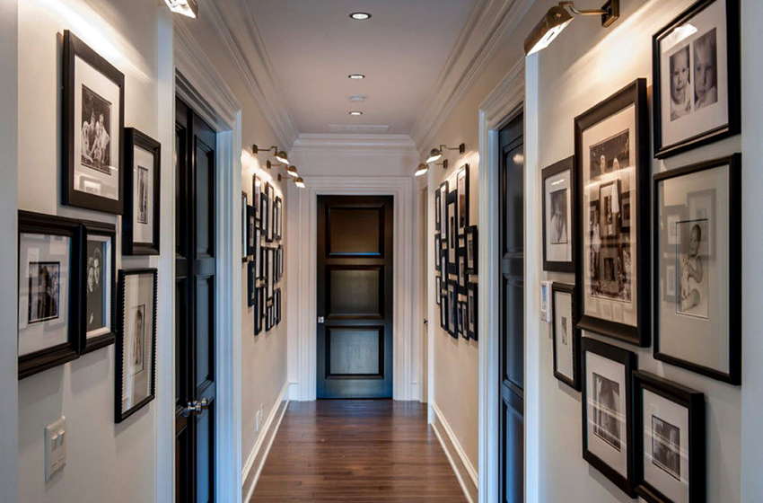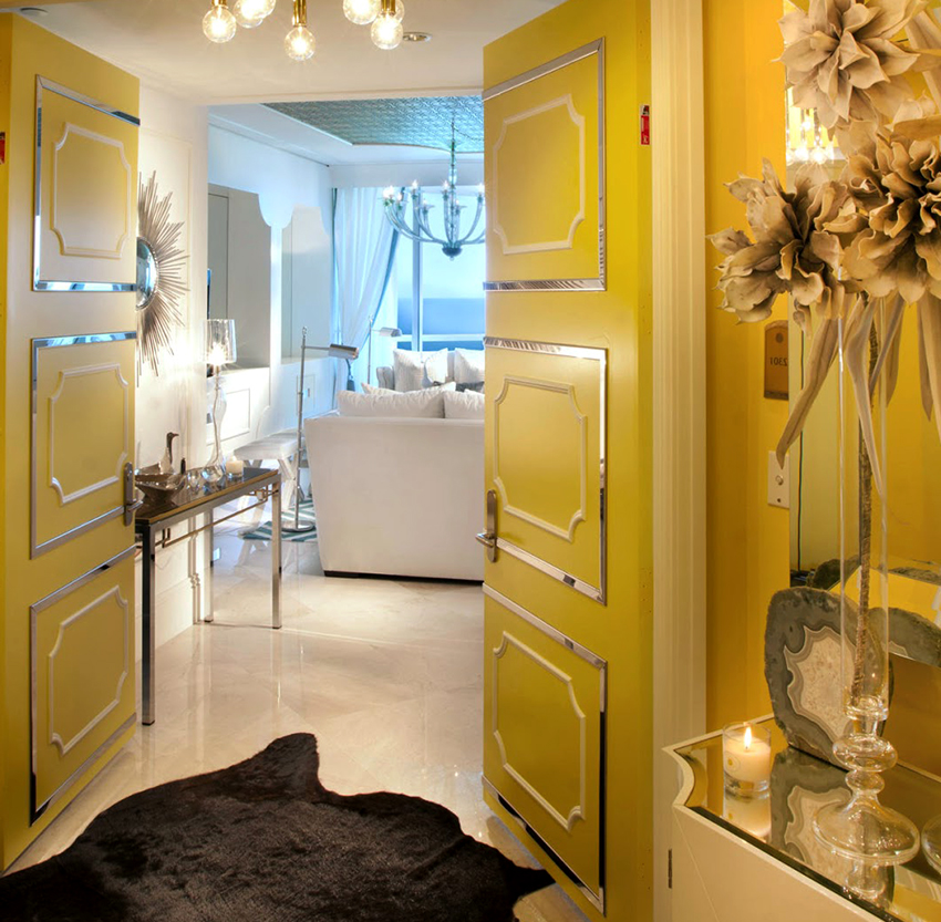 Pintu dengan jenis dan warna yang sama untuk semua bilik adalah penyelesaian paling mudah, terutama ketika mereka semua menghadap koridor yang sama, dan apartmennya dibuat dengan gaya yang sama. Dengan fokus pada warna dinding, nada pintu harus bertindak sebagai kontras dengan latar belakangnya, atau sesuai dengan rentang nada umum.