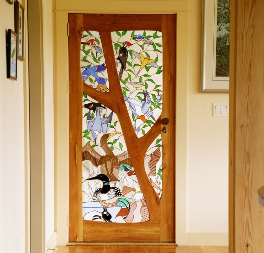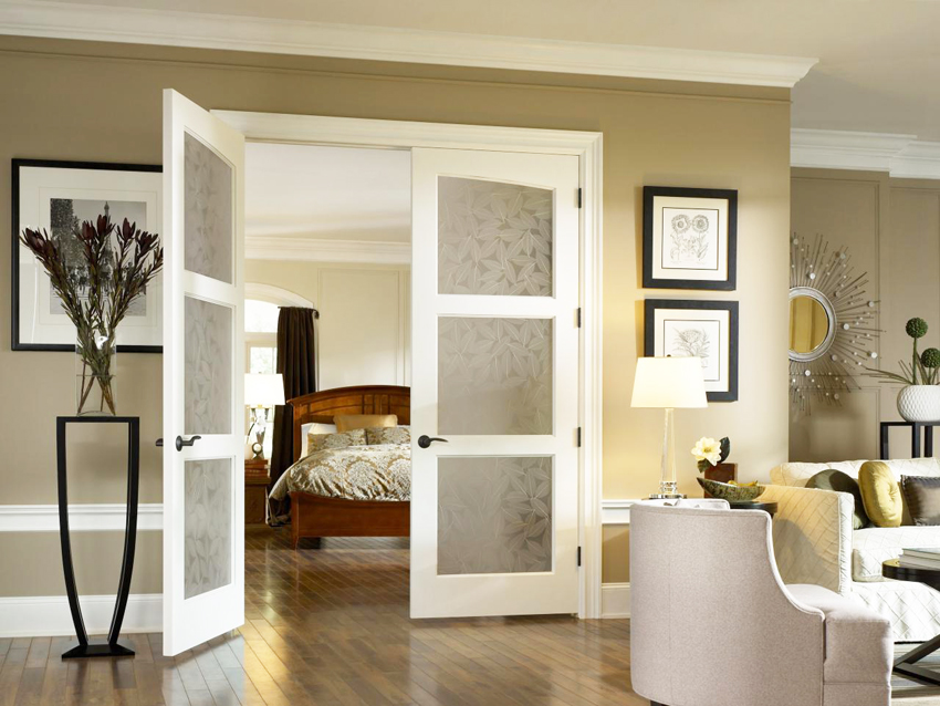 Keunikan bahan ini adalah kemungkinan yang tidak terhad dari segi hiasan, kerana pintu dengan sisipan kaca dapat digunakan di bahagian dalam yang sama sekali berbeza dengan gaya: klasik, berteknologi tinggi, moden dan lain-lain.