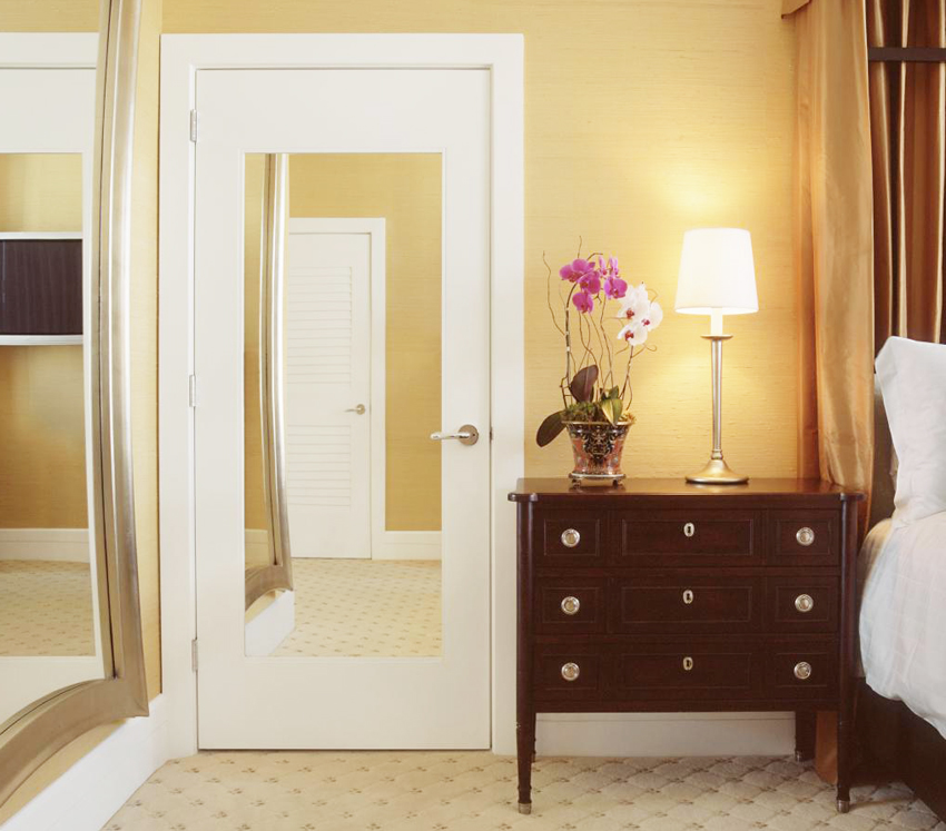 Pintu dalaman dengan cermin tidak hanya memperluas ruang secara visual, tetapi juga menjadikan ruangan lebih cerah