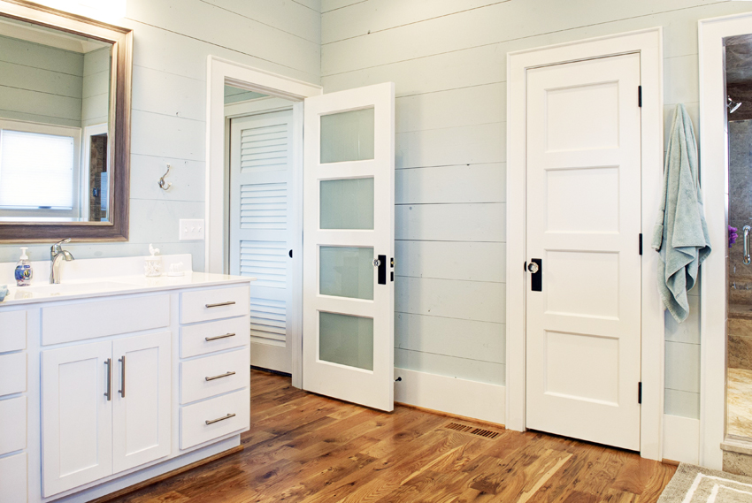 Nasihat berguna! Daun pintu yang terbuat dari kayu semula jadi adalah reka bentuk yang mahal, jadi anda dapat membeli model veneer dalam warna oak yang diputihkan. Pintu dalaman dengan kaca reka bentuk ini sesuai untuk gaya Provence.