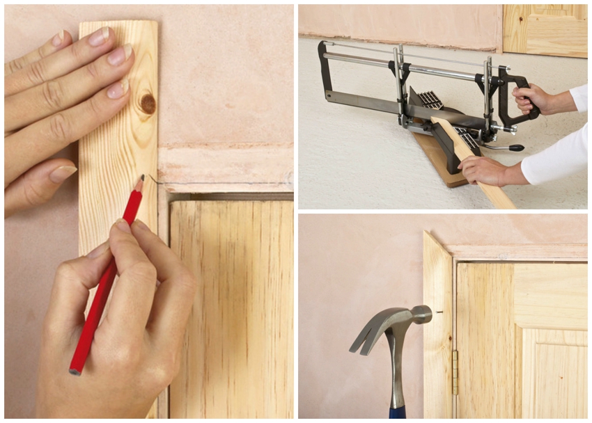 Untuk memahami cara memasang plat plat dengan betul pada pintu dalaman, anda perlu memahami kaedah pemasangan dan membuat pengukuran yang diperlukan. Pertama, mereka menandakan sudut potongan dan mengira panjang selongsong dengan tepat, yang dipotong dengan gergaji besi. Sekiranya tidak ada gergaji elektrik, maka kotak miter akan membantu memotong wang tunai pada sudut 45 darjah.