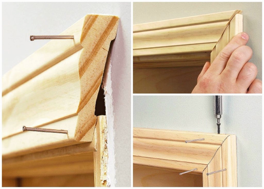 - pengancing platband pada sudut 90 darjah dilakukan dengan jahitan mendatar atau menegak. Pilihan bergantung pada pilihan pemiliknya. Apabila penguasaan pintu dipasang dengan tangan anda sendiri pada sudut yang betul, tempat kosong hanya digunakan dalam bentuk rata. Tempat pemotongan dirawat dengan cat berasaskan varnis atau akrilik.