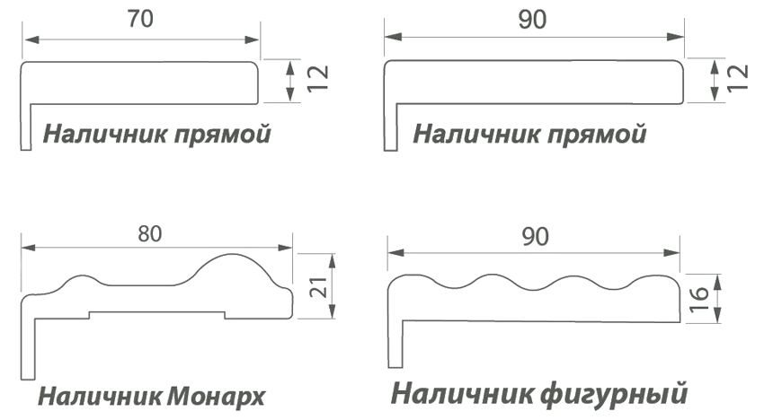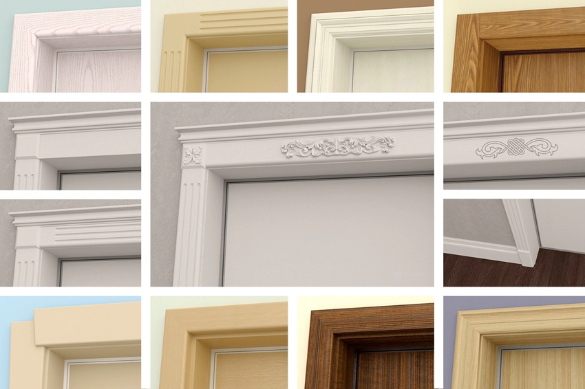 Seperti yang disebutkan di atas, trim untuk pintu dalaman dalam bentuknya bisa rata, setengah lingkaran, bulat atau timbul. Kategori yang terpisah adalah penguasaan dalam bentuk modal, di mana bahagian atasnya mempunyai bentuk hiasan khas. Bergantung pada kaedah pemasangan, mereka dapat di atas kepala, yang dipasang dengan kuku khas, serta teleskopik dengan rabung pemasangan, yang dimasukkan ke dalam alur bingkai pintu.