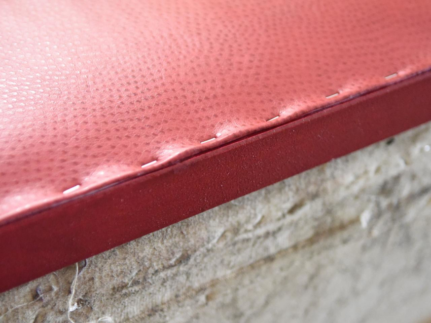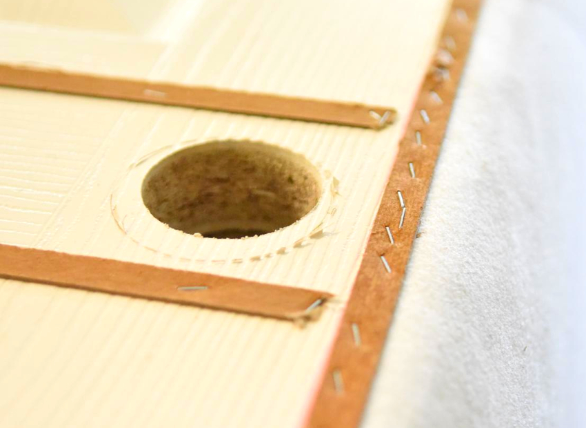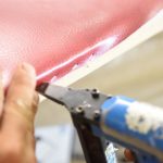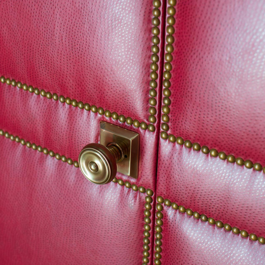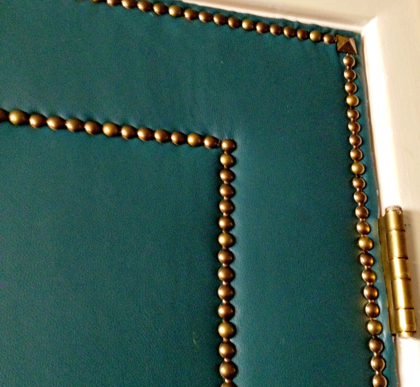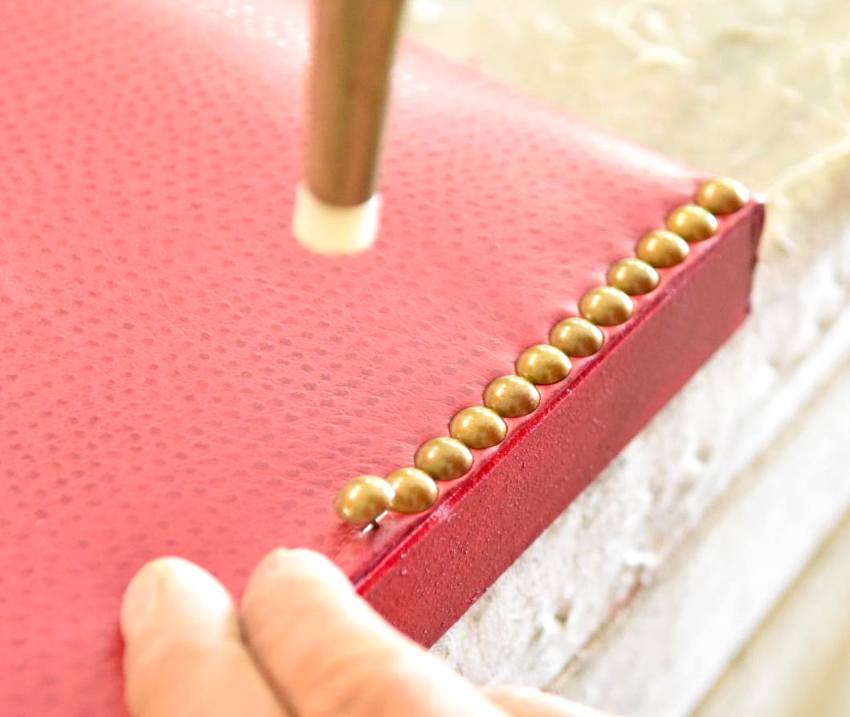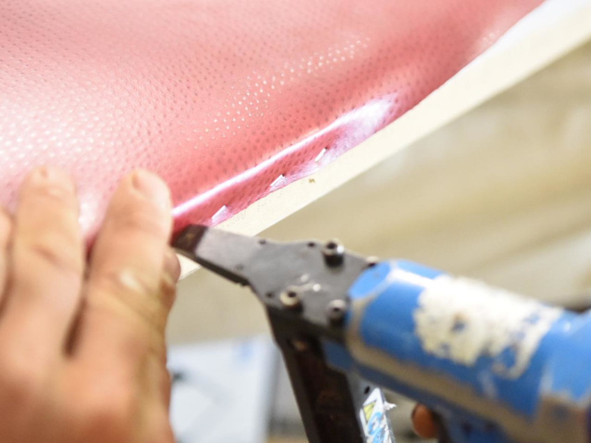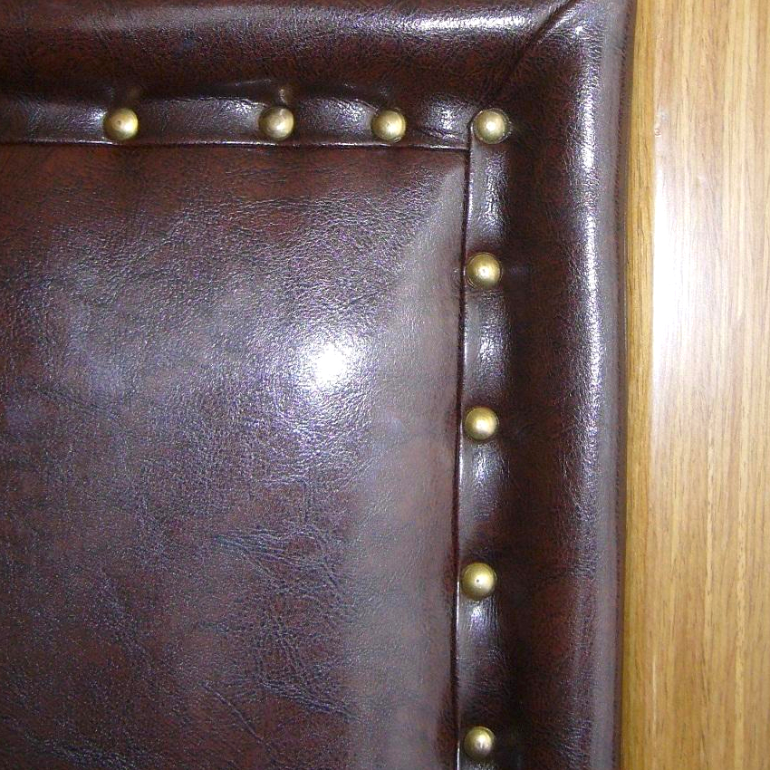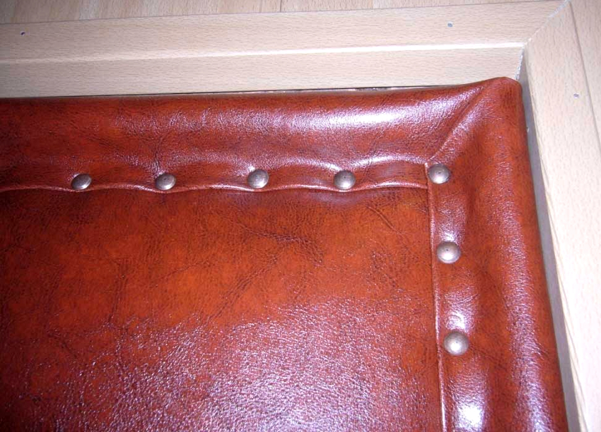 Leatherette digunakan di atas penebat, tepinya dibengkokkan, bahannya dipasang ke pintu dengan paku.