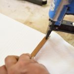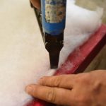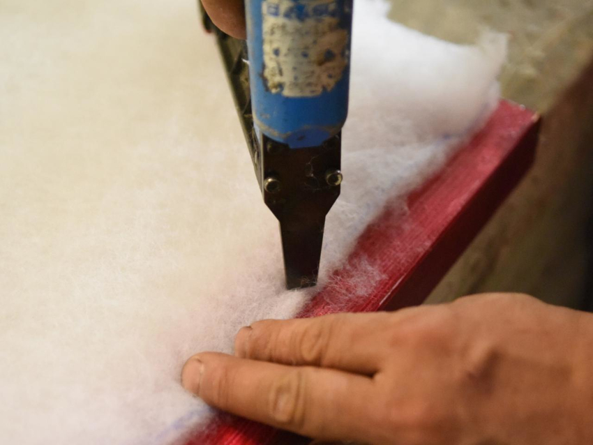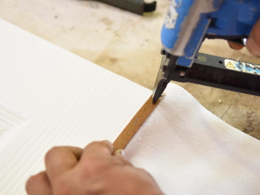 Daun pintu diletakkan secara mendatar - semestinya di atas penyokong, akibatnya akses mudah ke sisi daun pintu disediakan. Dengan bantuan stapler, penebat dipasang padanya sepanjang keseluruhan perimeter.