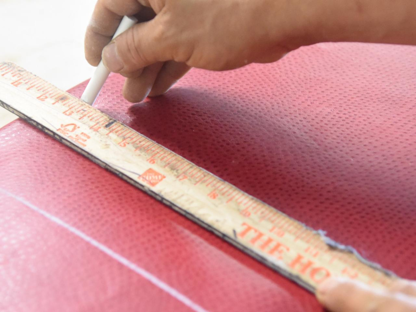 Pengukuran kanvas dilakukan, pengiraan dibuat. Potongan kulit kecil harus lebih besar dari ukuran pintu, sehingga margin sekurang-kurangnya 3 cm terbentuk di semua sisi. Perlu bahawa lapisan busa atau isolone 0,2-0,4 cm lebih kecil di semua sisi daripada daun pintu. Semasa membajak secara luaran di kawasan engsel, indent tambahan harus dibuat.