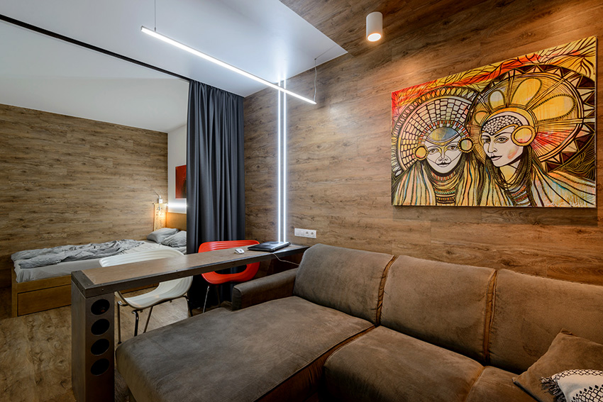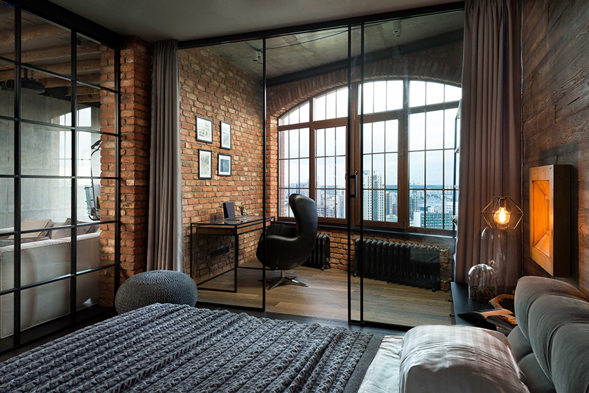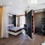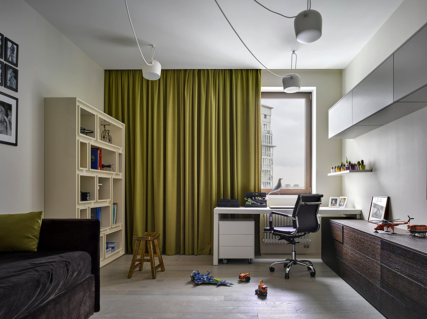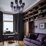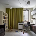 Tirai dalaman boleh digunakan untuk memisahkan ruang belajar dari bilik tidur. Mereka akan meredam keparahan perabot kerja, menjadikan ruangan lebih selesa, dan tidak akan melanggar glamour persekitaran yang terbakar.