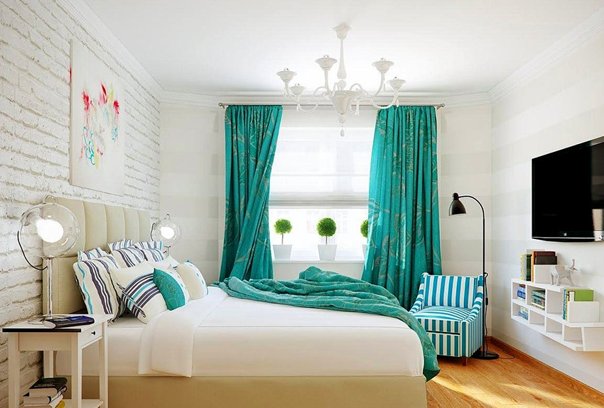 Sebuah bilik kecil memerlukan pendekatan khas untuk reka bentuk dalaman. Jangan membahayakan adalah salah satu peraturan.Sekiranya ruangan itu terletak di tingkat bawah atau matahari menerangi dengan sinar langsung selama 4-5 jam sehari, anda tidak boleh melakukan tanpa tirai, iaitu, tanpa menggantung tingkap dengan kain tebal. Jika tidak, rasa tidak selesa tidak dapat dielakkan.