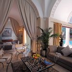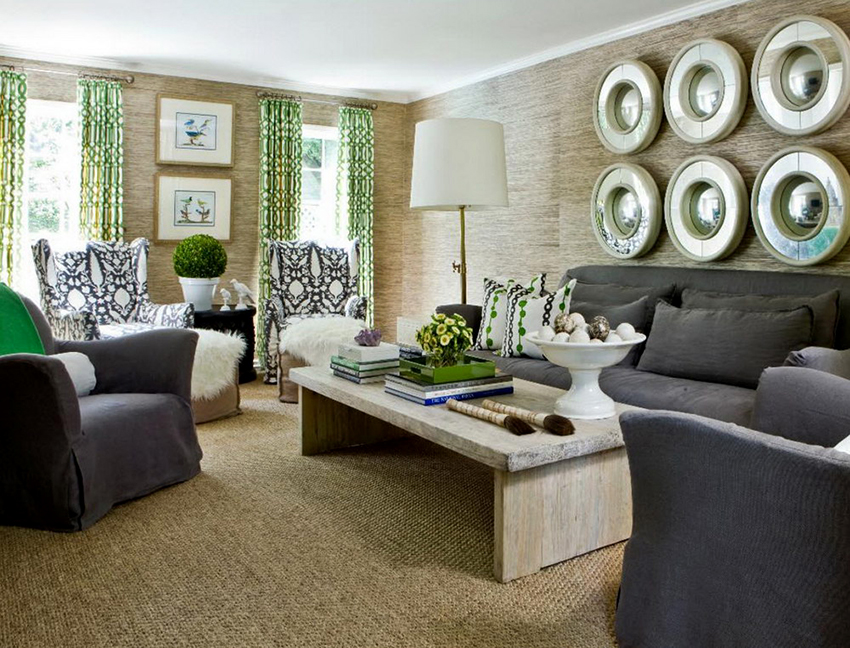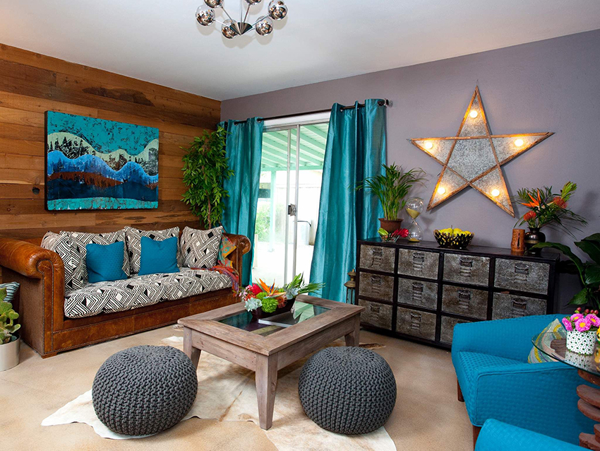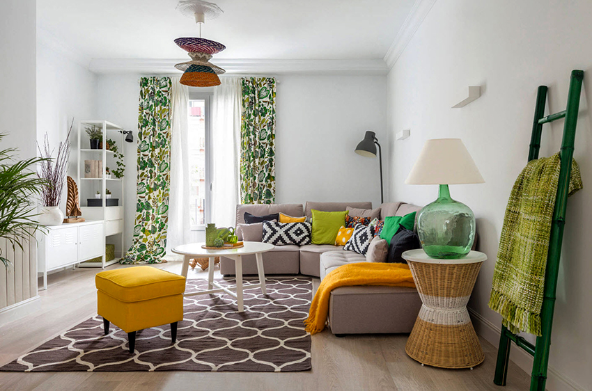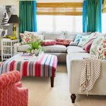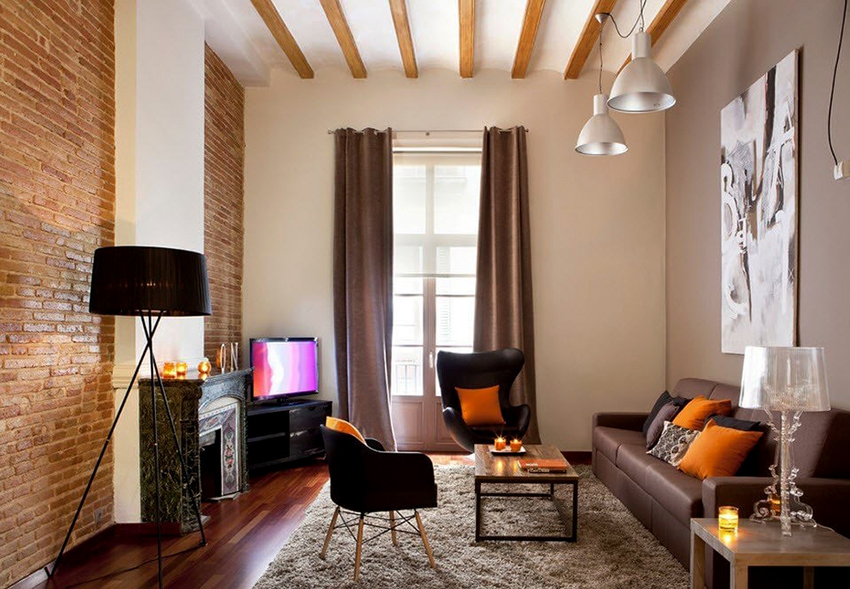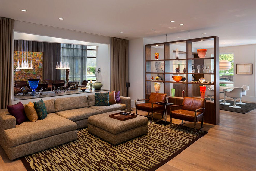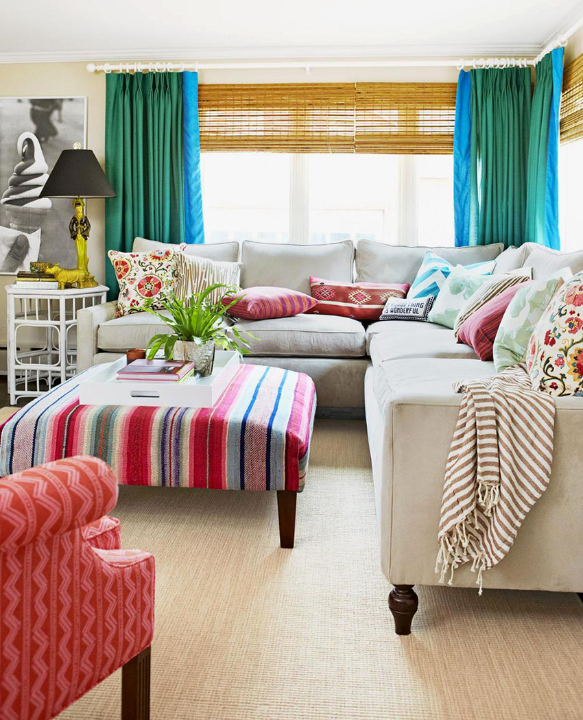 Gabungan kain dengan tekstur dan warna yang berbeza, penggunaan struktur pelbagai lapisan, penggunaan sikat untuk hiasan, pinggiran membolehkan anda mempelbagaikan bahagian dalam ruang tamu, menjadikannya unik.