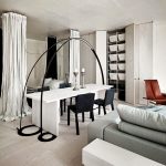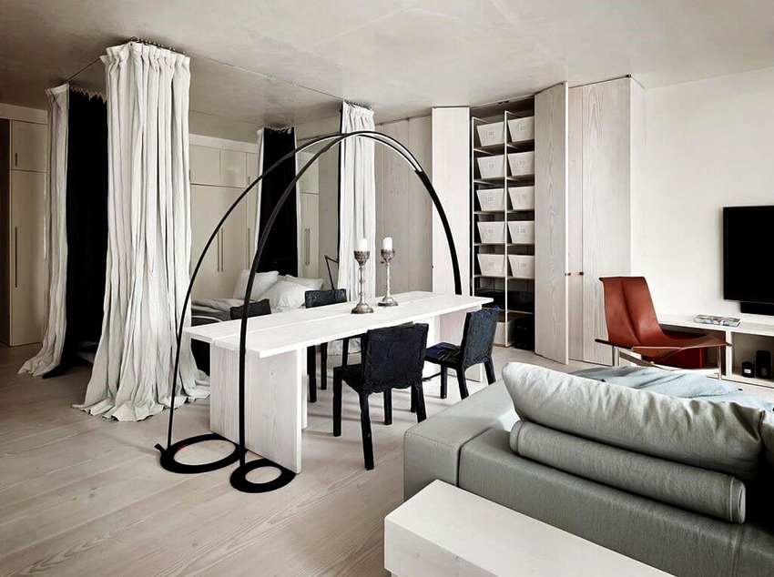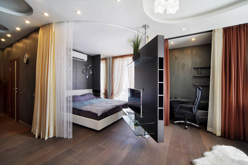 Dengan bantuan langsir, anda boleh mengezon bilik. Sekiranya ukuran kanvas besar, iaitu garis pemisahnya panjang, lebih baik memilih kain polos. Struktur siling yang terbuat dari paip sesuai sebagai alat tambahan, dan lebih baik menggantungkan tirai pada kelopak mata. Apabila mengezonkan dengan cara ini, kekuatan adalah penting. Dan pergerakan kanvas semasa proses pembukaan akan lancar.